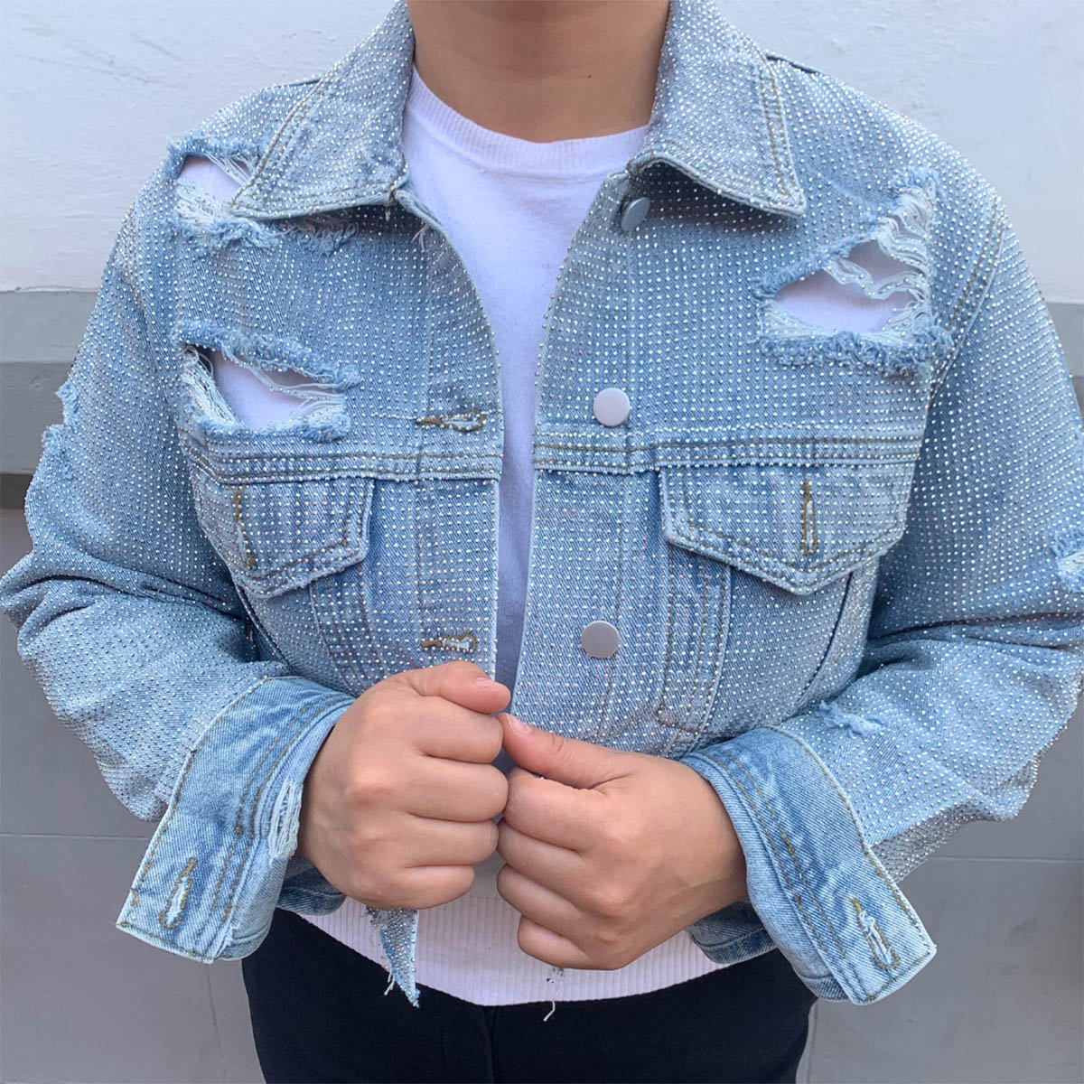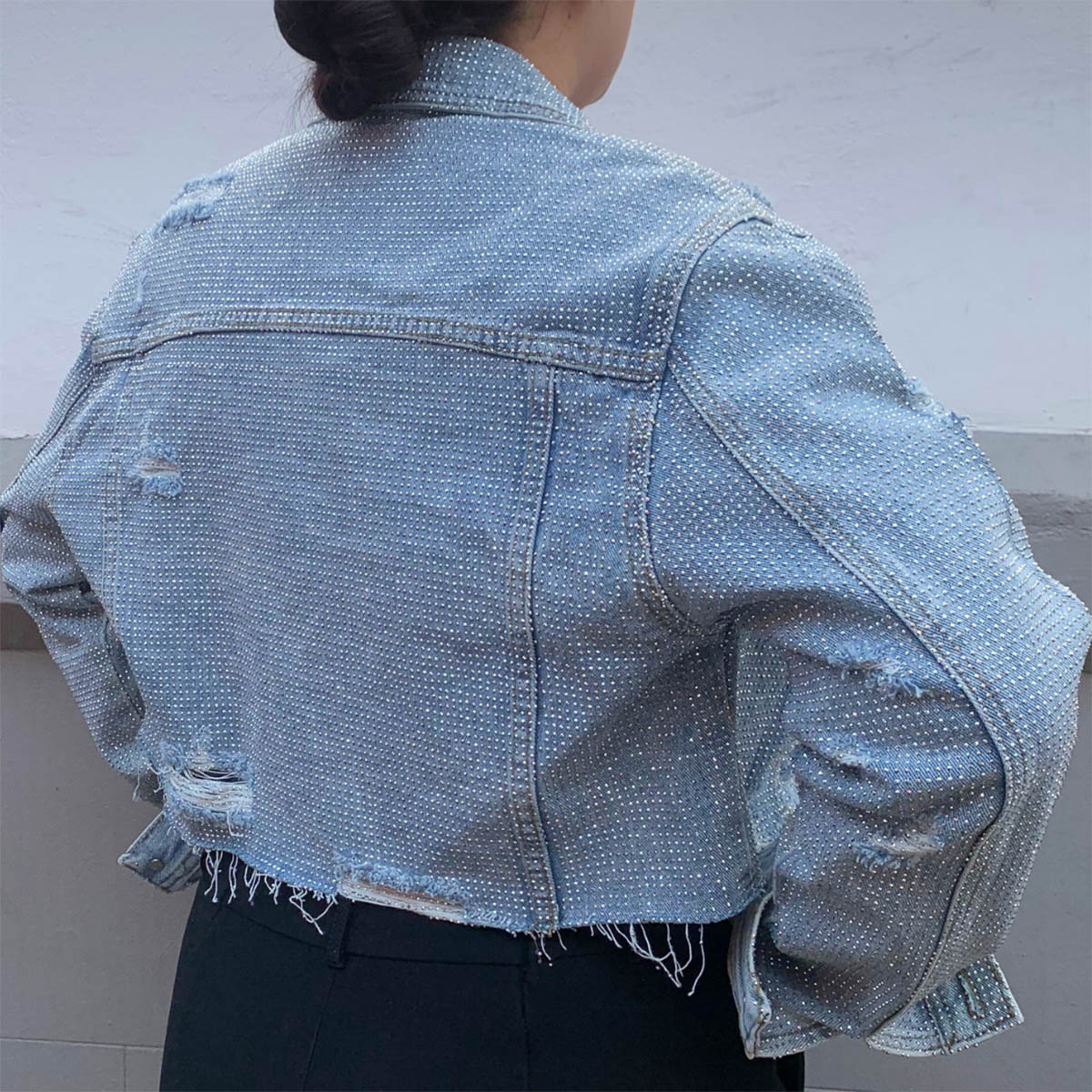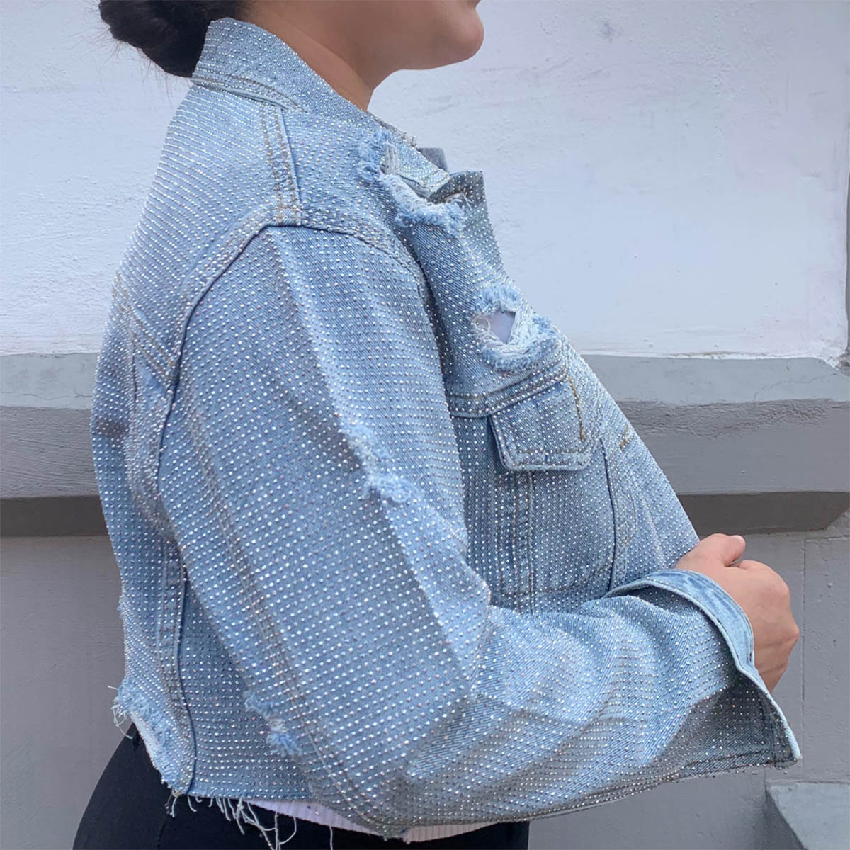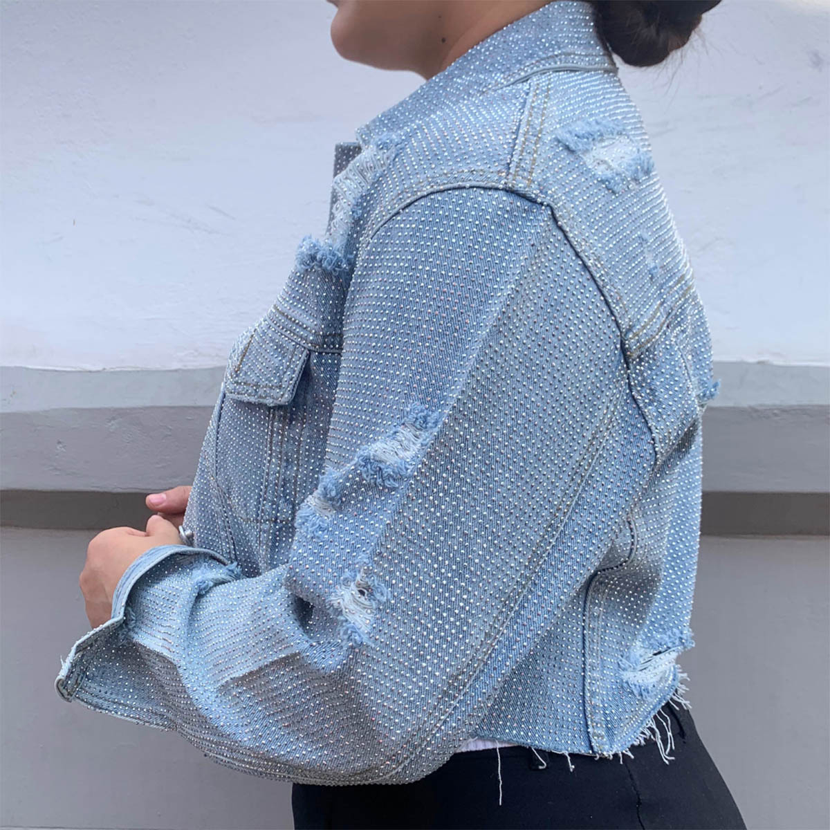 Chamarra de mezclilla azul con un diseño sofisticado que combina la versatilidad clásica con detalles luminosos. Su corte entallado realza la silueta, mientras que los brillos estratégicamente distribuidos añaden un toque de elegancia contemporánea. Cierre de botones metálicos que complementan el acabado refinado.
