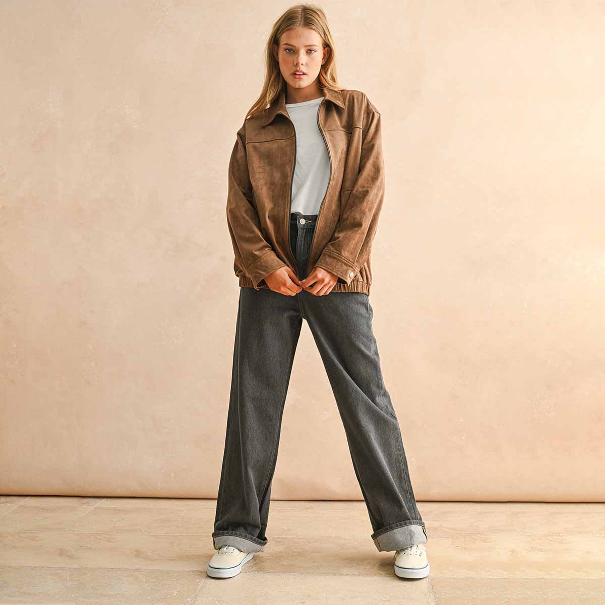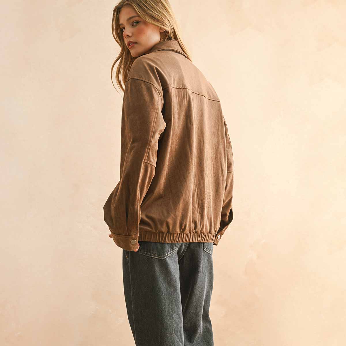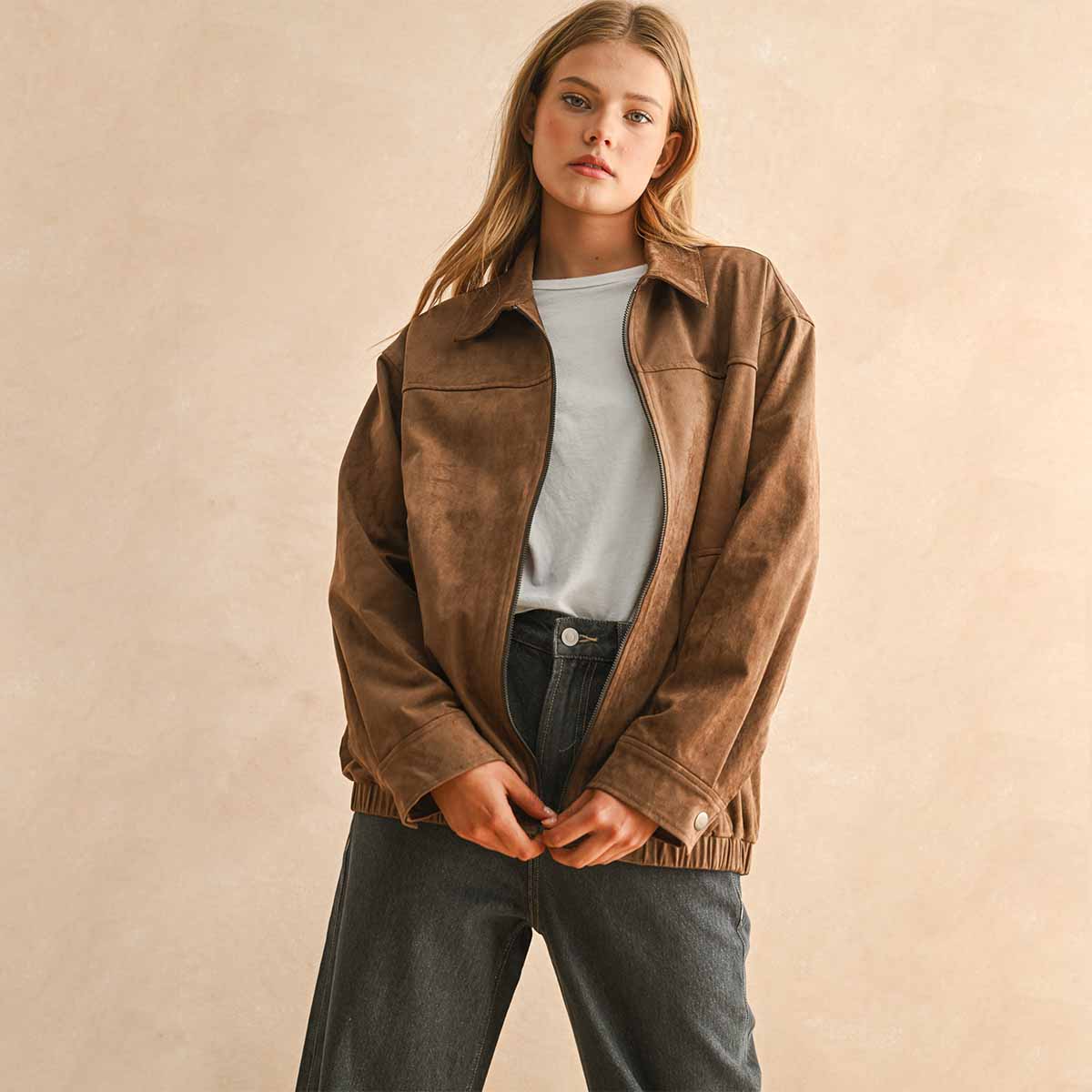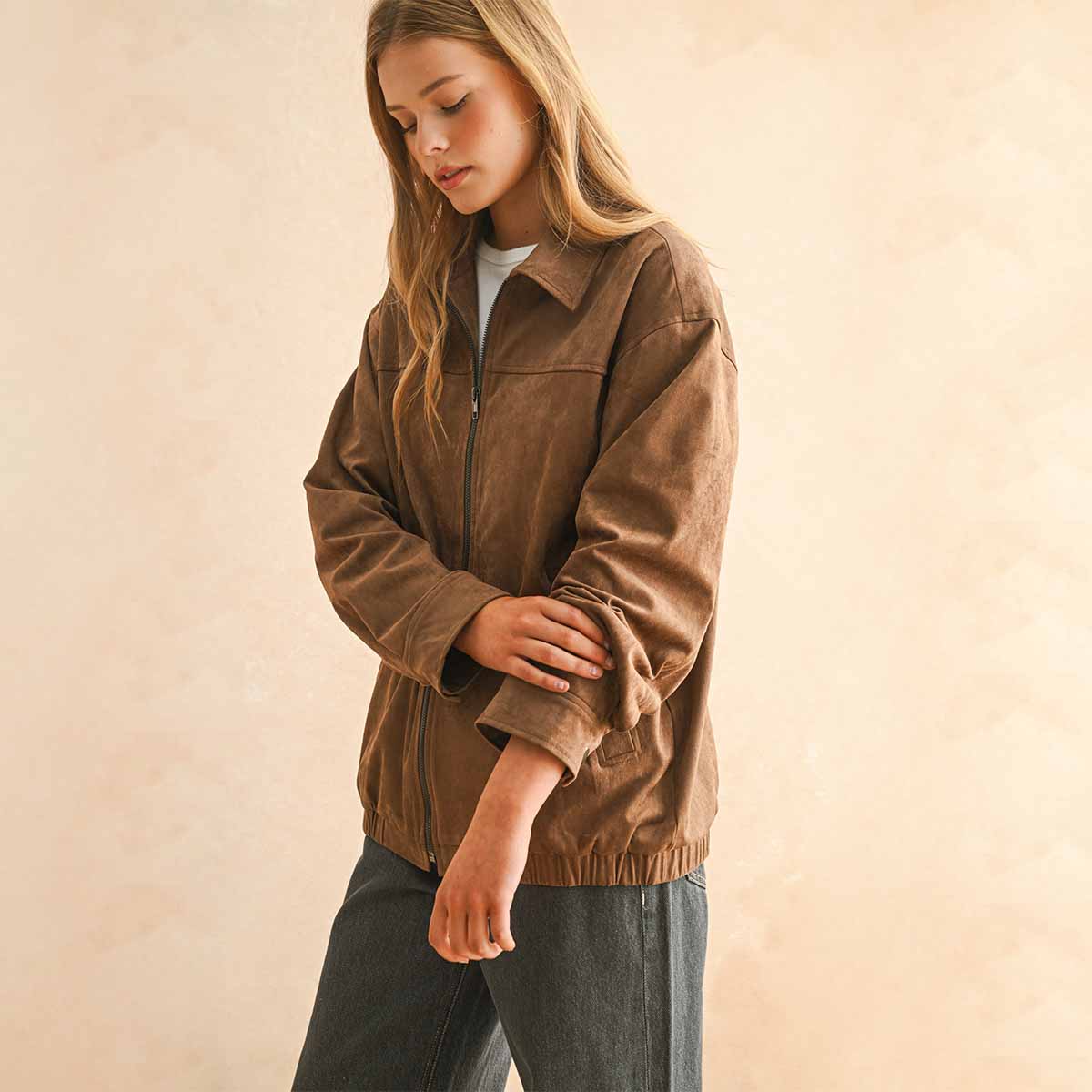 Chamarra café de gamuza combina elegancia y funcionalidad con su cierre de zipper suave y bolsillos prácticos. Su diseño ligero y elástico en la parte baja aseguran un ajuste cómodo y estilizado, ideal para quienes buscan sofisticación sin sacrificar comodidad.
