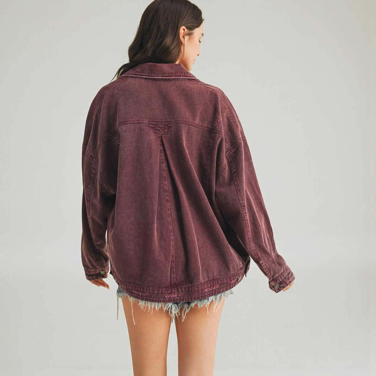 Chamarra de mezclilla en tono guinda que combina estilo y comodidad. Su corte oversize proporciona una silueta relajada y moderna, perfecta para crear looks casuales con personalidad. Confeccionada en denim resistente, esta prenda versátil se adapta a cualquier ocasión, desde paseos urbanos hasta encuentros informales.