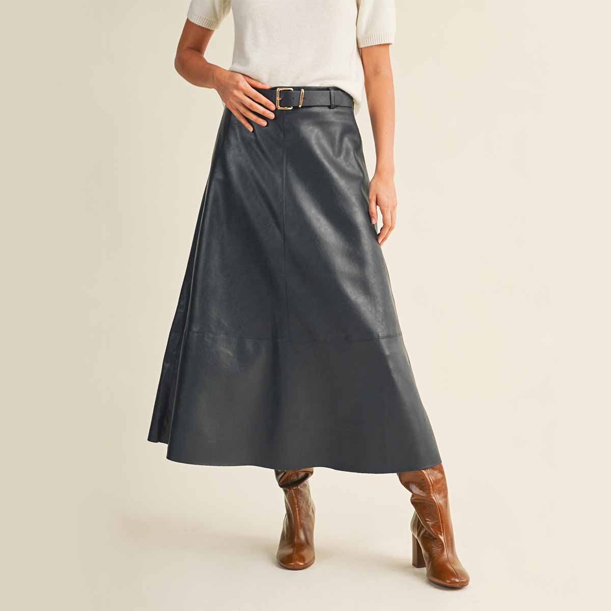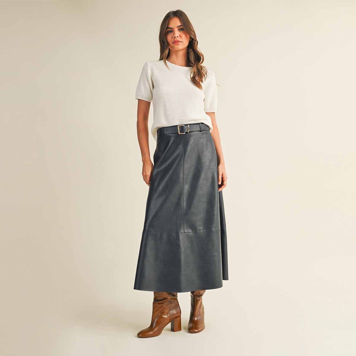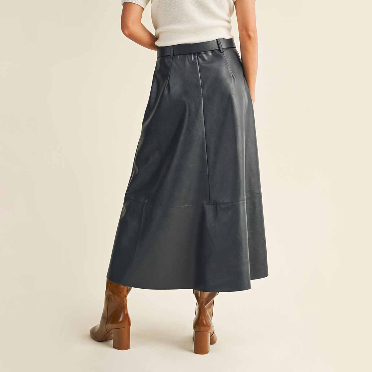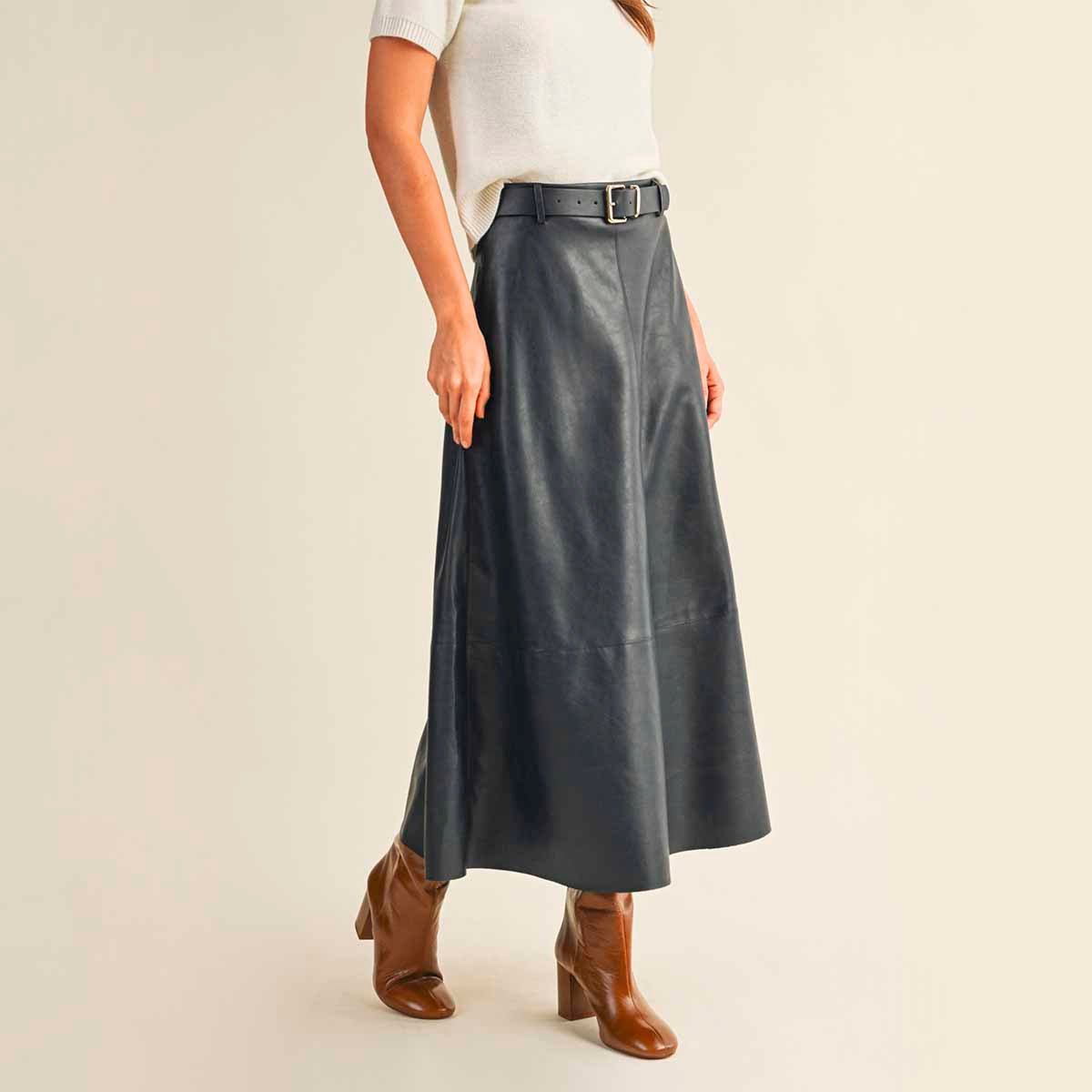 Falda larga de vinipiel combina elegancia y estilo con su diseño de volumen que aporta movimiento y presencia. Cuenta con un cinto ajustable que permite un ajuste perfecto a la cintura, resaltando la silueta de manera sofisticada.