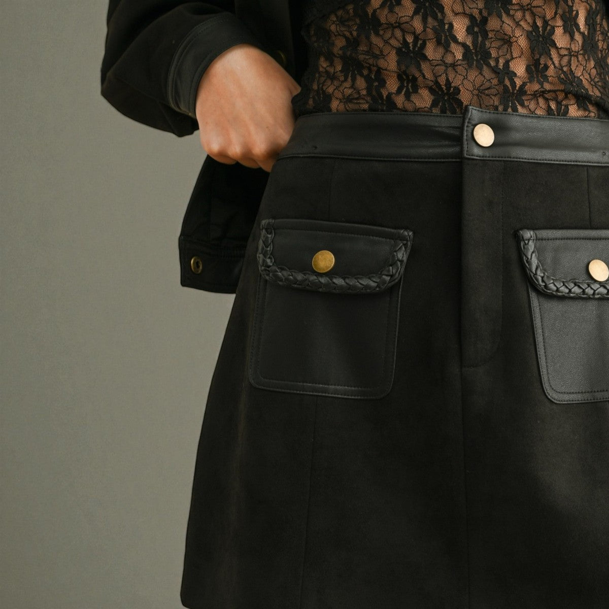 Falda negra confeccionada en una sofisticada combinación de vinipiel y gamuza que garantiza durabilidad y elegancia. Cuenta con prácticos bolsos al frente que añaden funcionalidad sin comprometer el diseño.