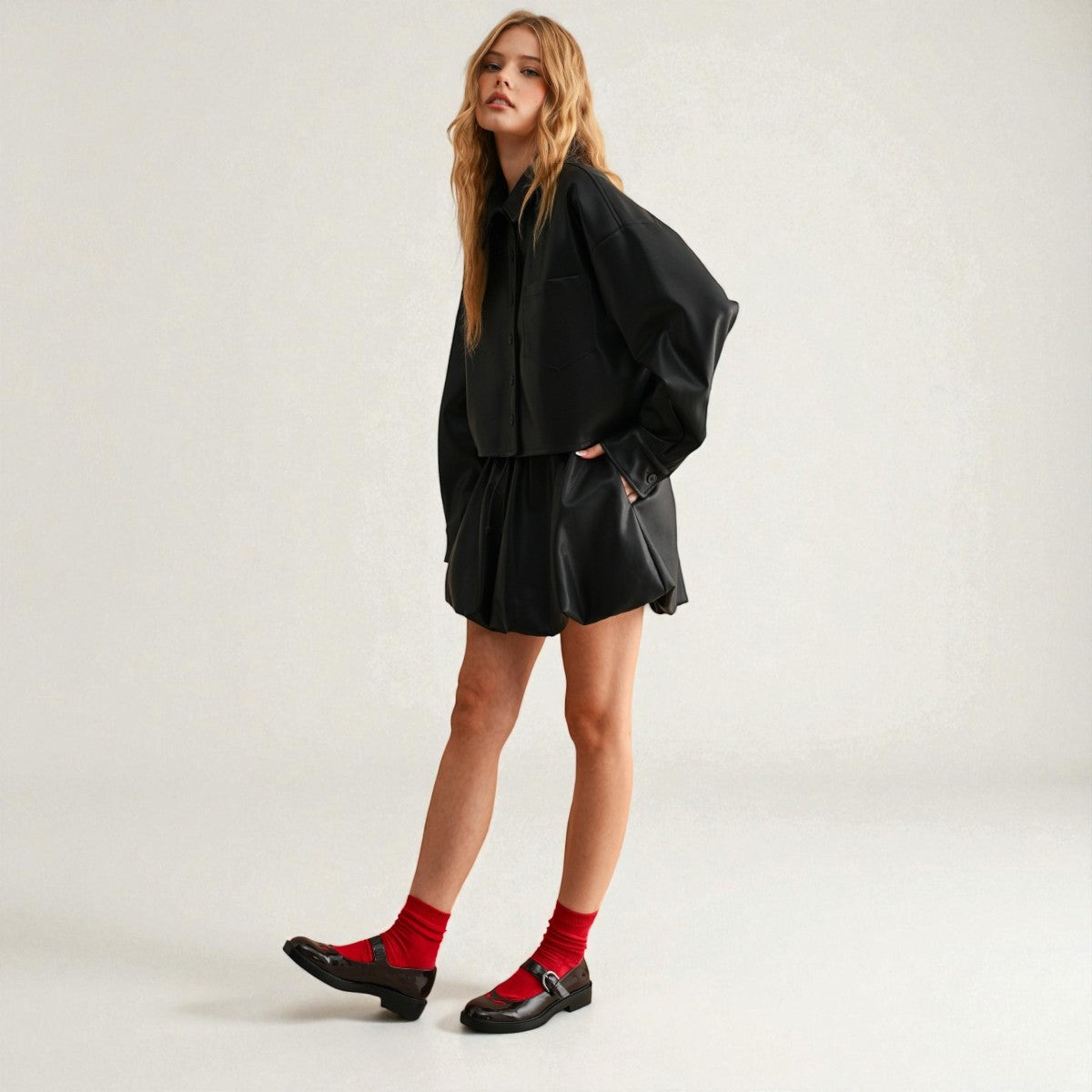 Falda elegante confeccionada en vinipiel de alta calidad que ofrece un acabado sofisticado y moderno. Diseño de corte globo que proporciona volumen y movimiento, creando una silueta distintiva. Cuenta con cintura elástica para mayor comodidad y ajuste personalizado mediante cordones.