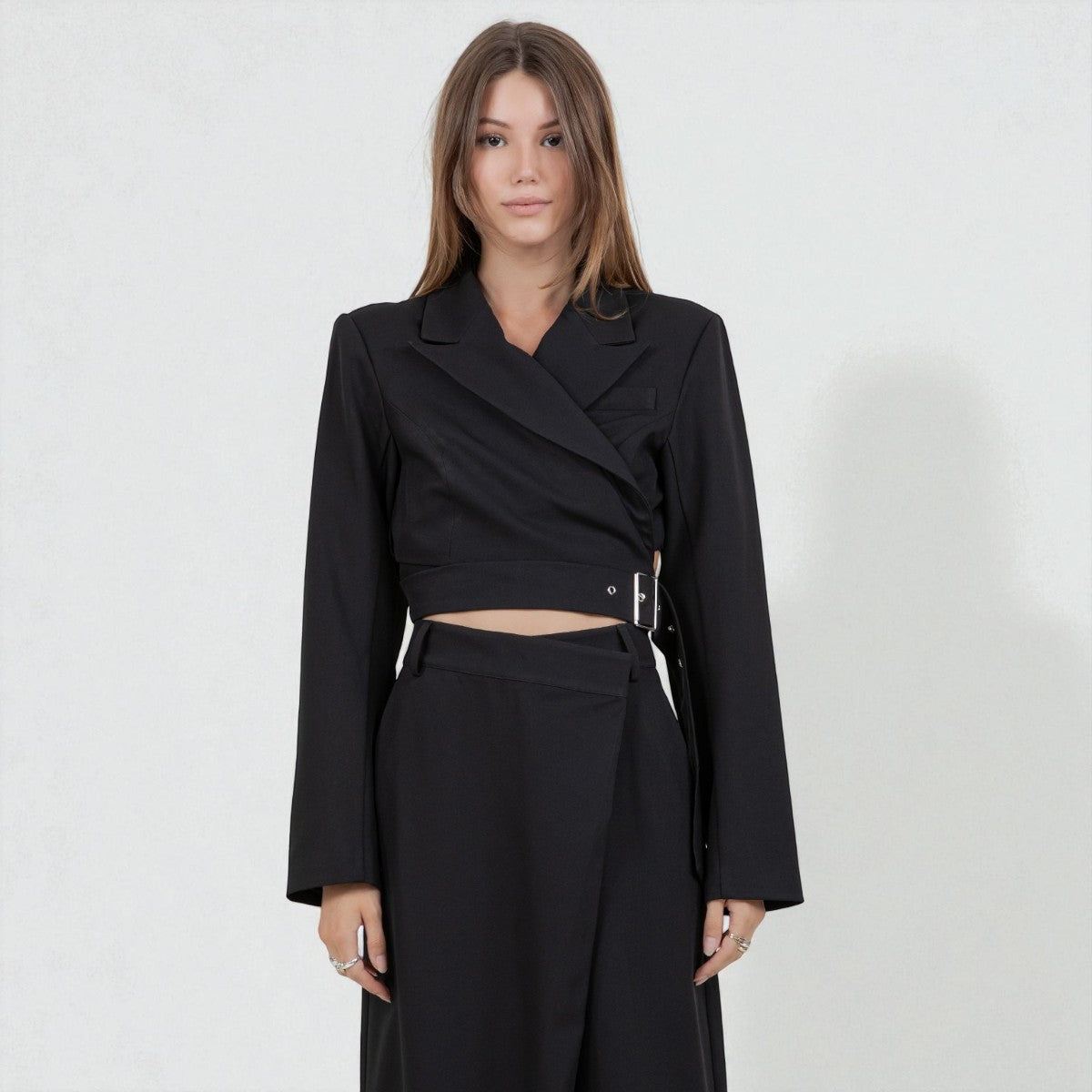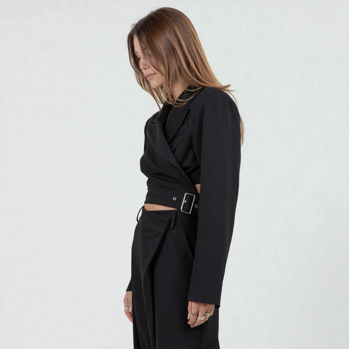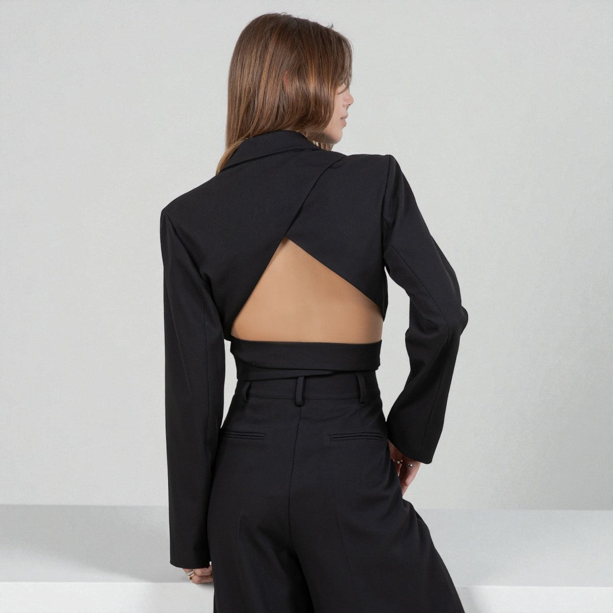 Saco negro corto con cierre cruzado ajustable que realza la silueta. Diseño moderno con espalda descubierta y cuello en V profundo para un look sofisticado y atrevido.