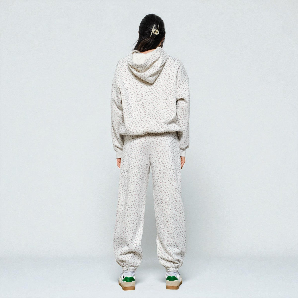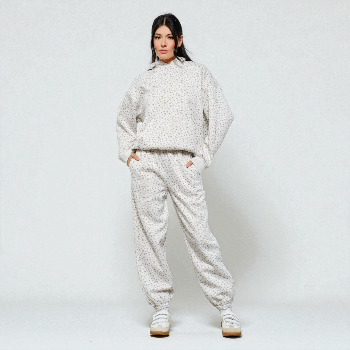 Set versátil que combina comodidad y estilo. Incluye pantalonera con cintura elástica y bolsillos laterales funcionales, sudadera de manga corta con diseño floral elegante y gorro a juego.
