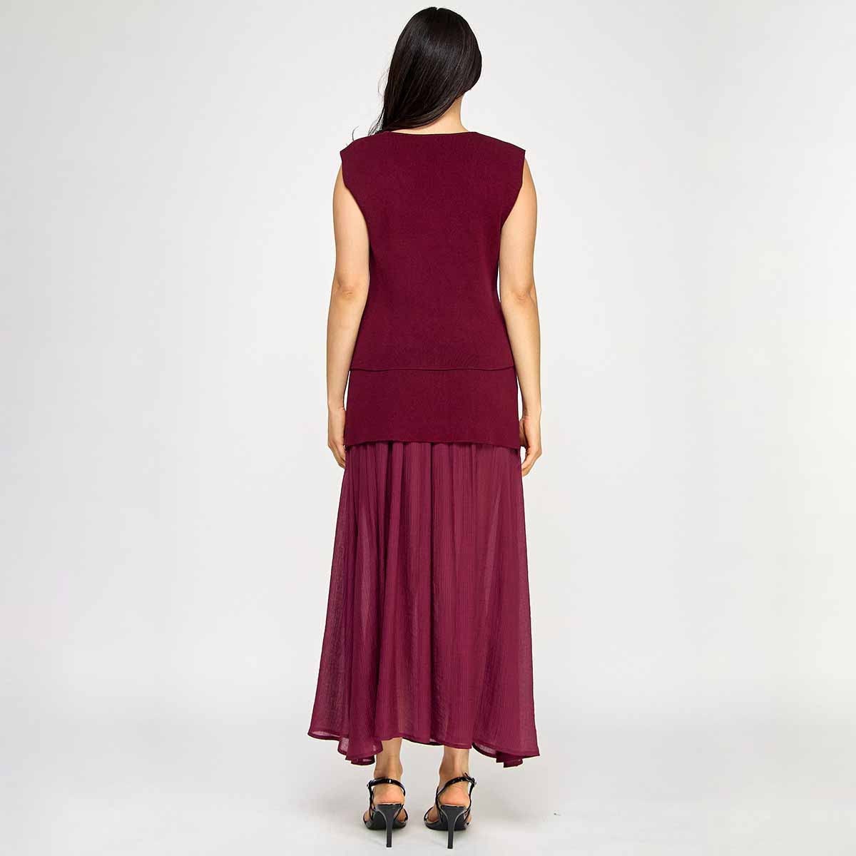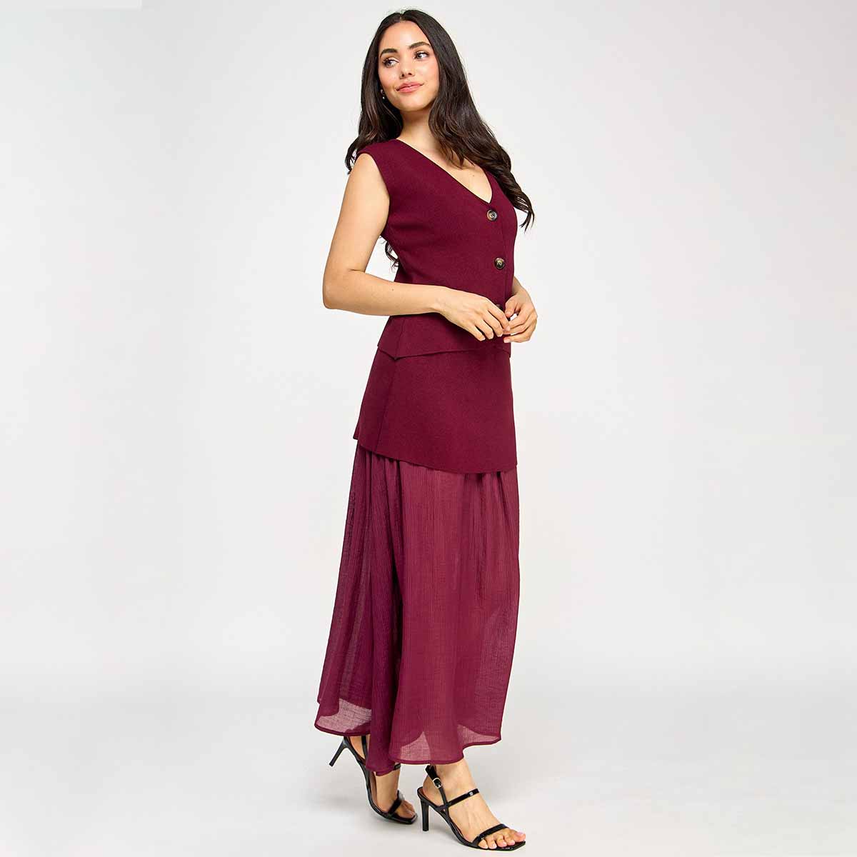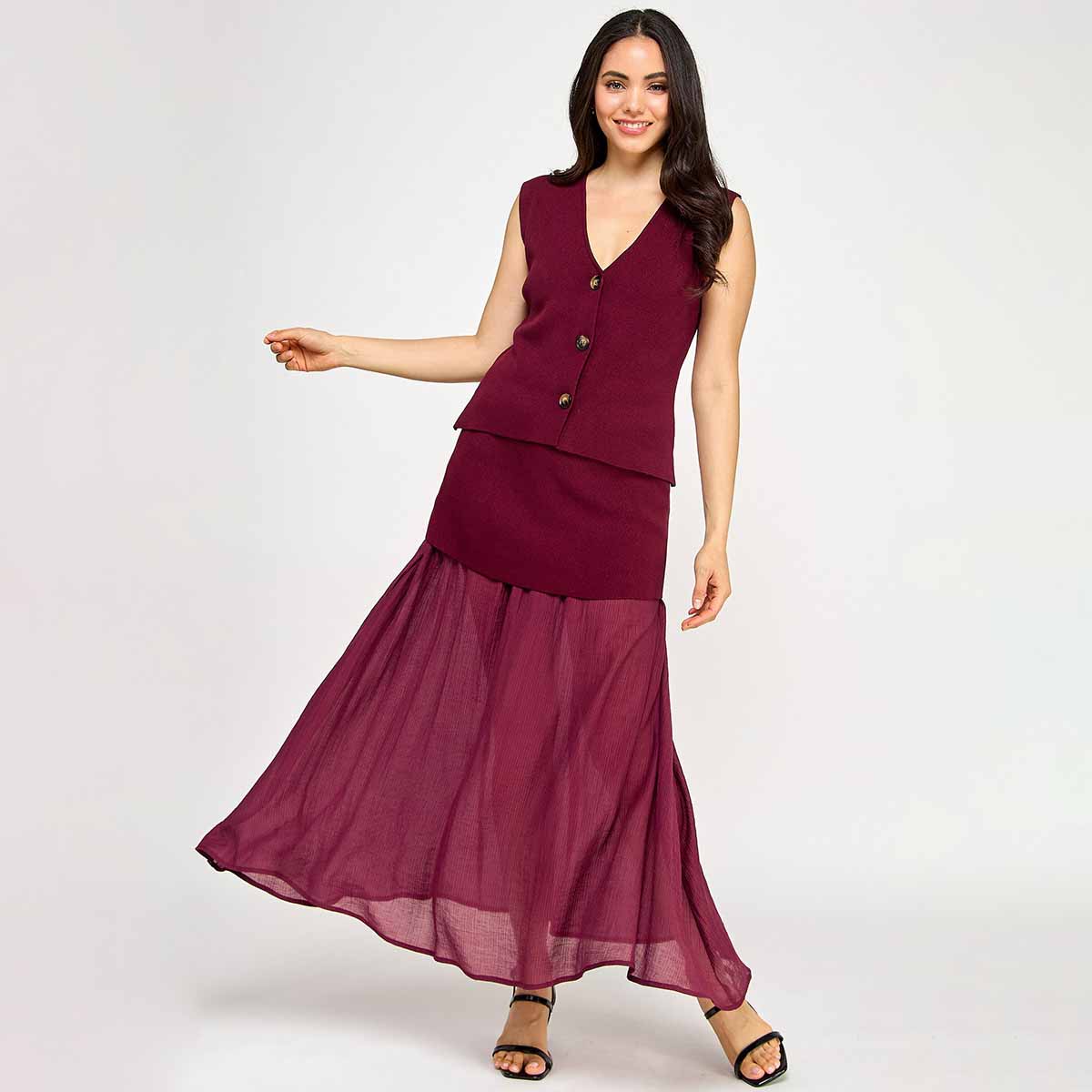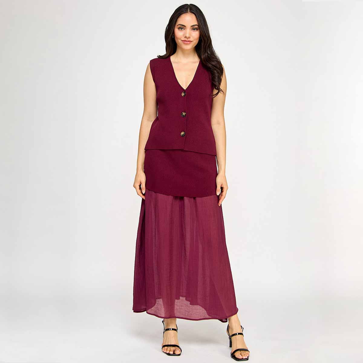 Este elegante set vino combina un chaleco con cierre de botones y una falda de punto que se destaca por su fondo trasparente largo, aportando un toque sofisticado y moderno.