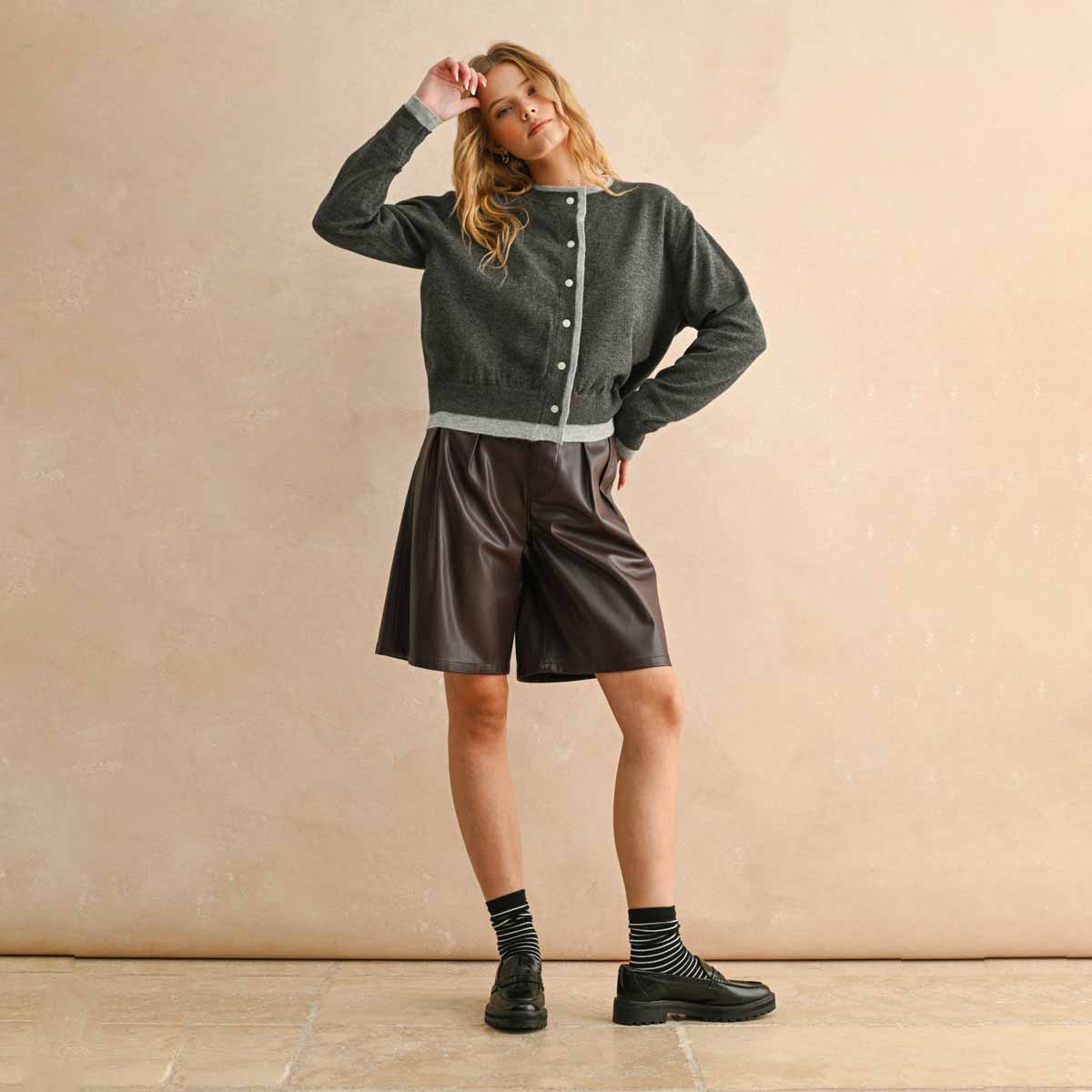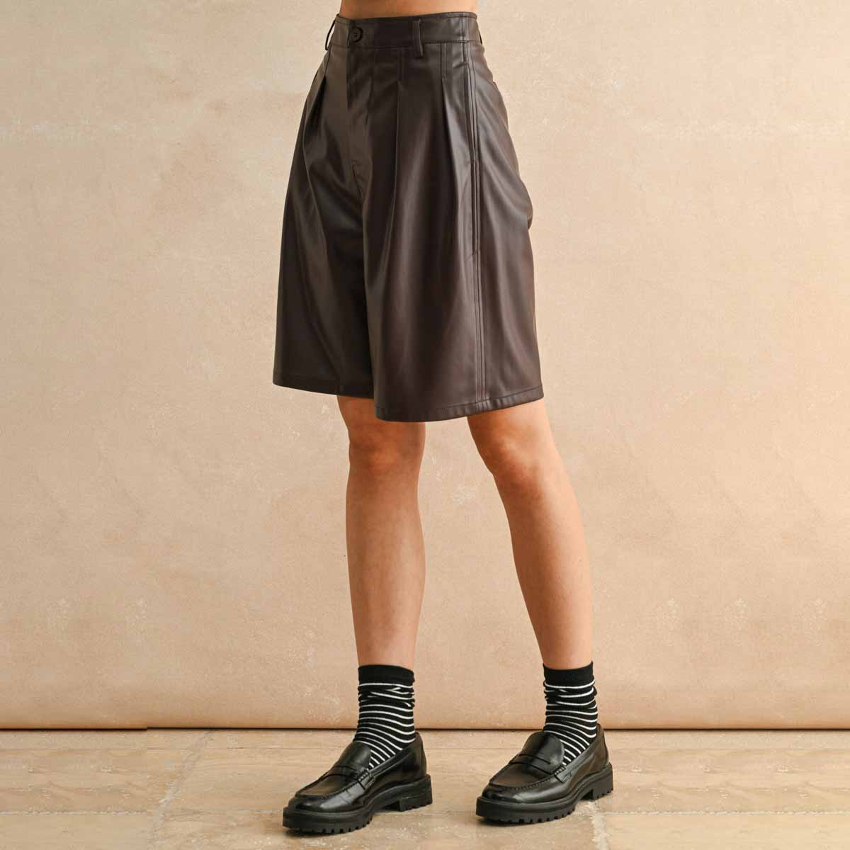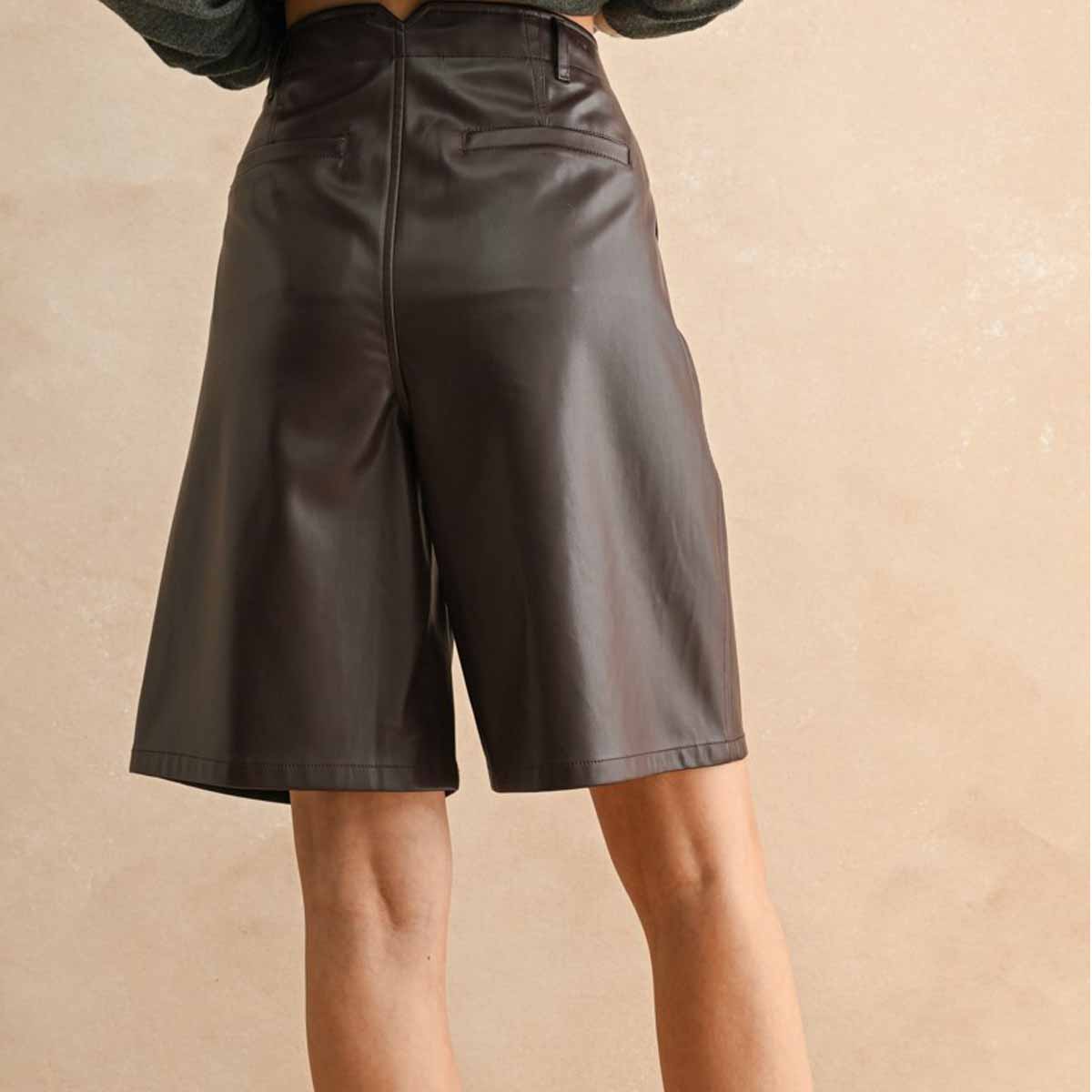 Short en vinipiel combina estilo y confort con un diseño único. Sus bolsos laterales y pinzas al frente realzan la silueta, ofreciendo un toque sofisticado ideal para cualquier ocasión.