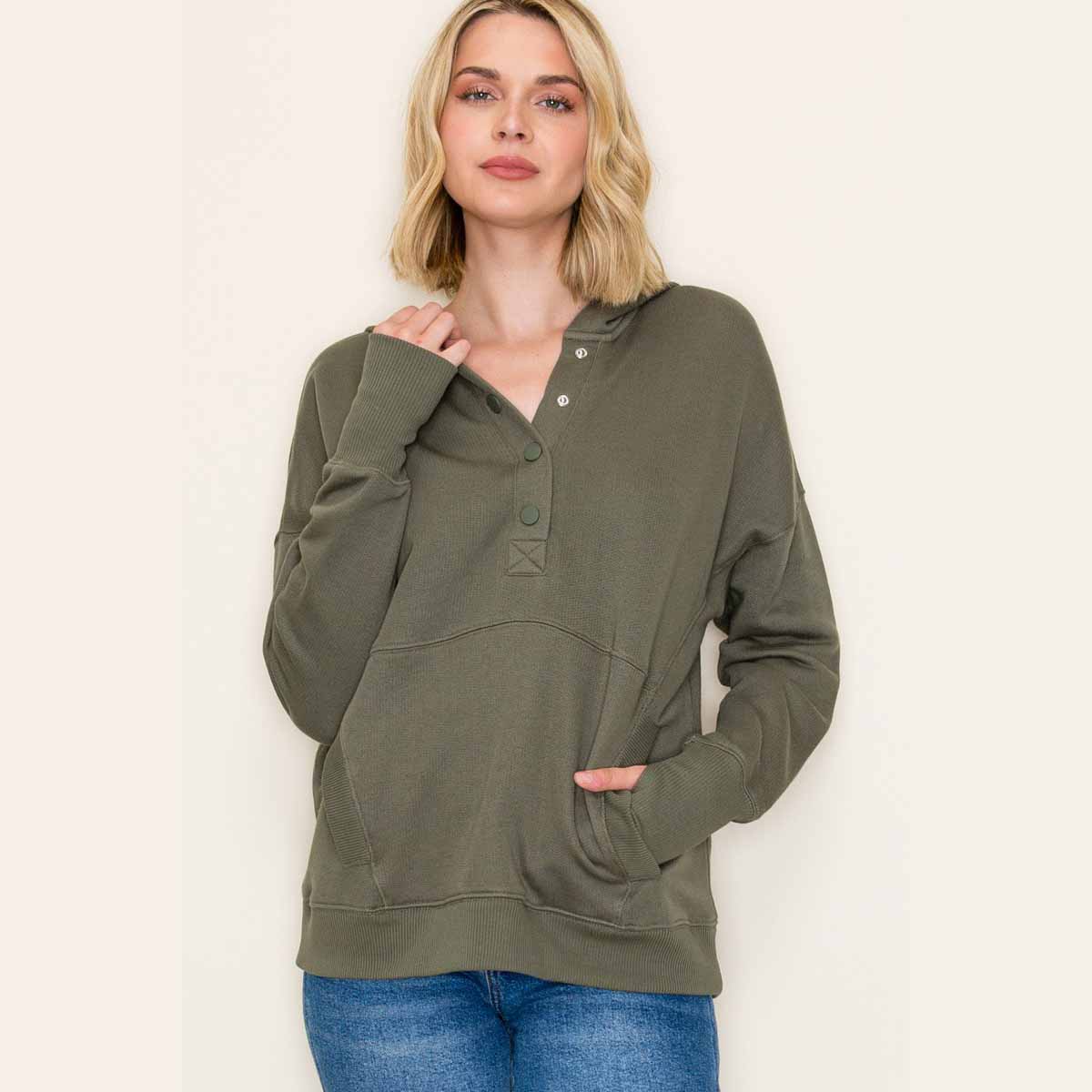 Confeccionada en tela ligera, presenta un gorro integrado perfecto para días frescos, botones funcionales en el cuello para ajuste personalizado y bolsillos frontales prácticos.