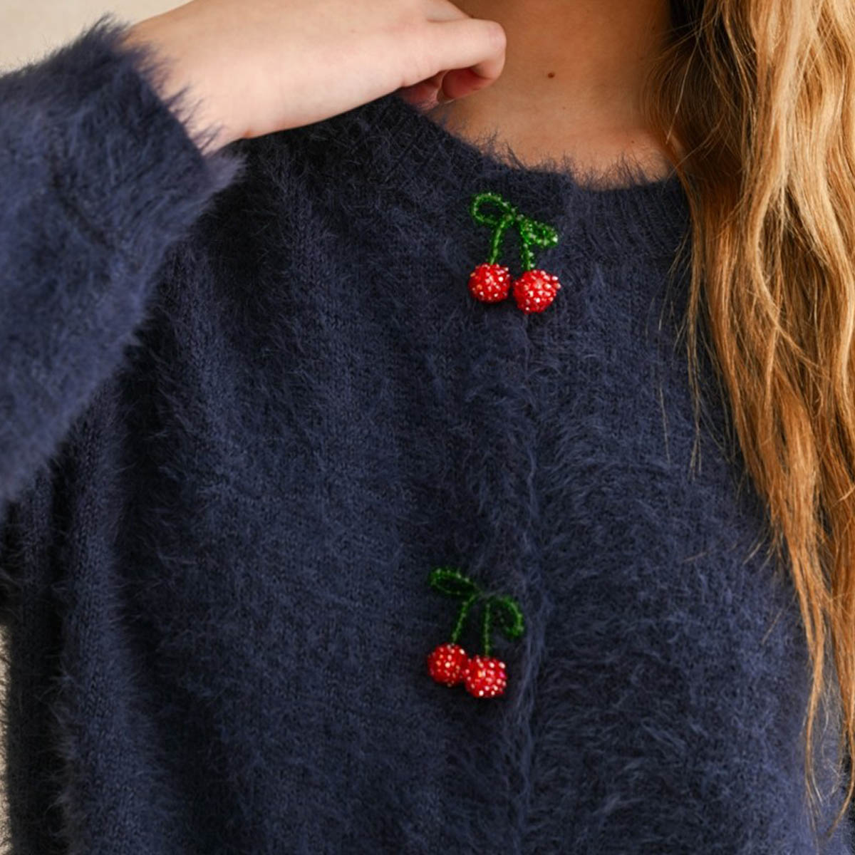 Suéter de peluche profundo que combina calidez y elegancia. Confeccionado con un tejido suave y acogedor, presenta un cierre frontal de botones decorativos con diseño de cerezas que añade un toque distintivo y refinado. Las mangas largas proporcionan cobertura completa, ideal para las temporadas frías.