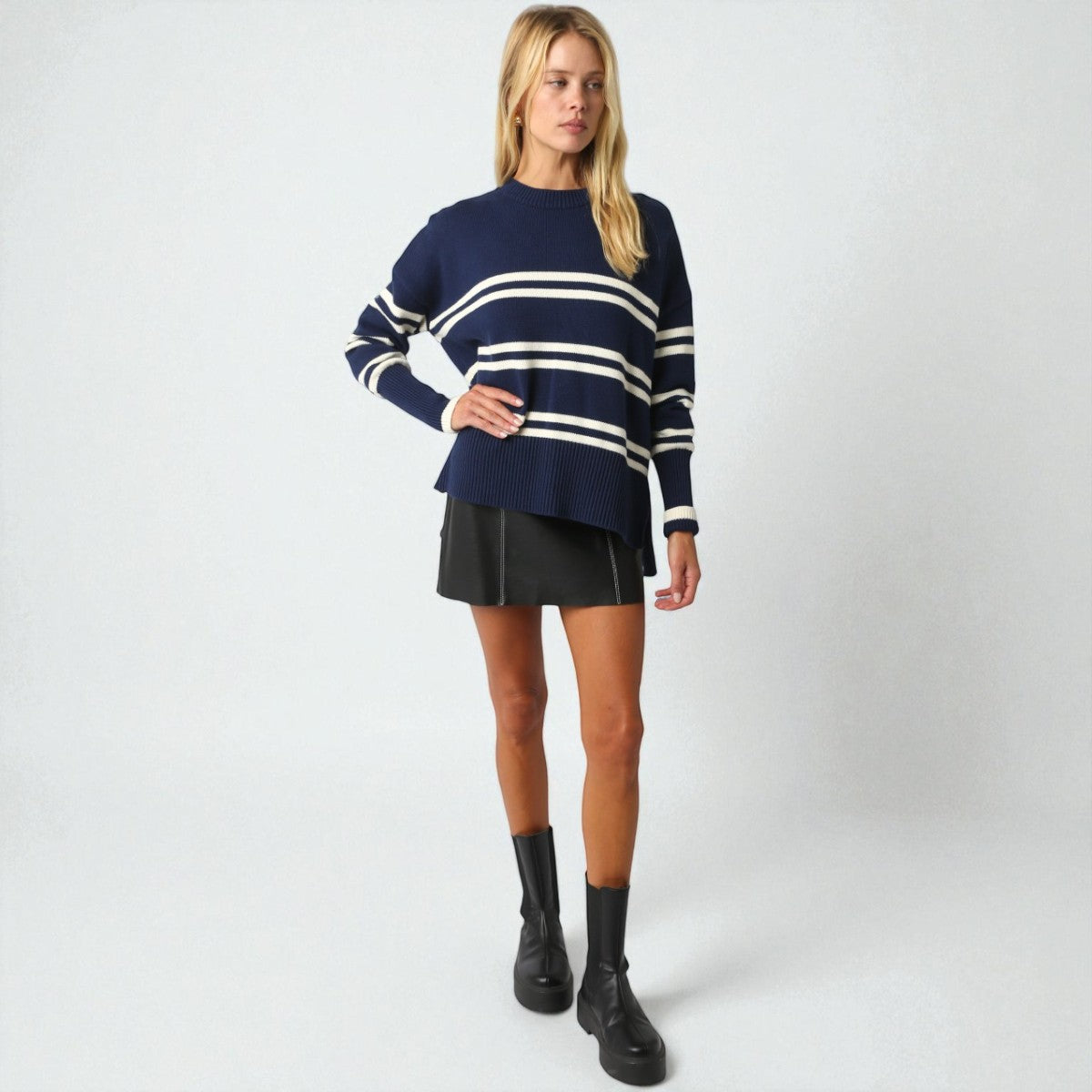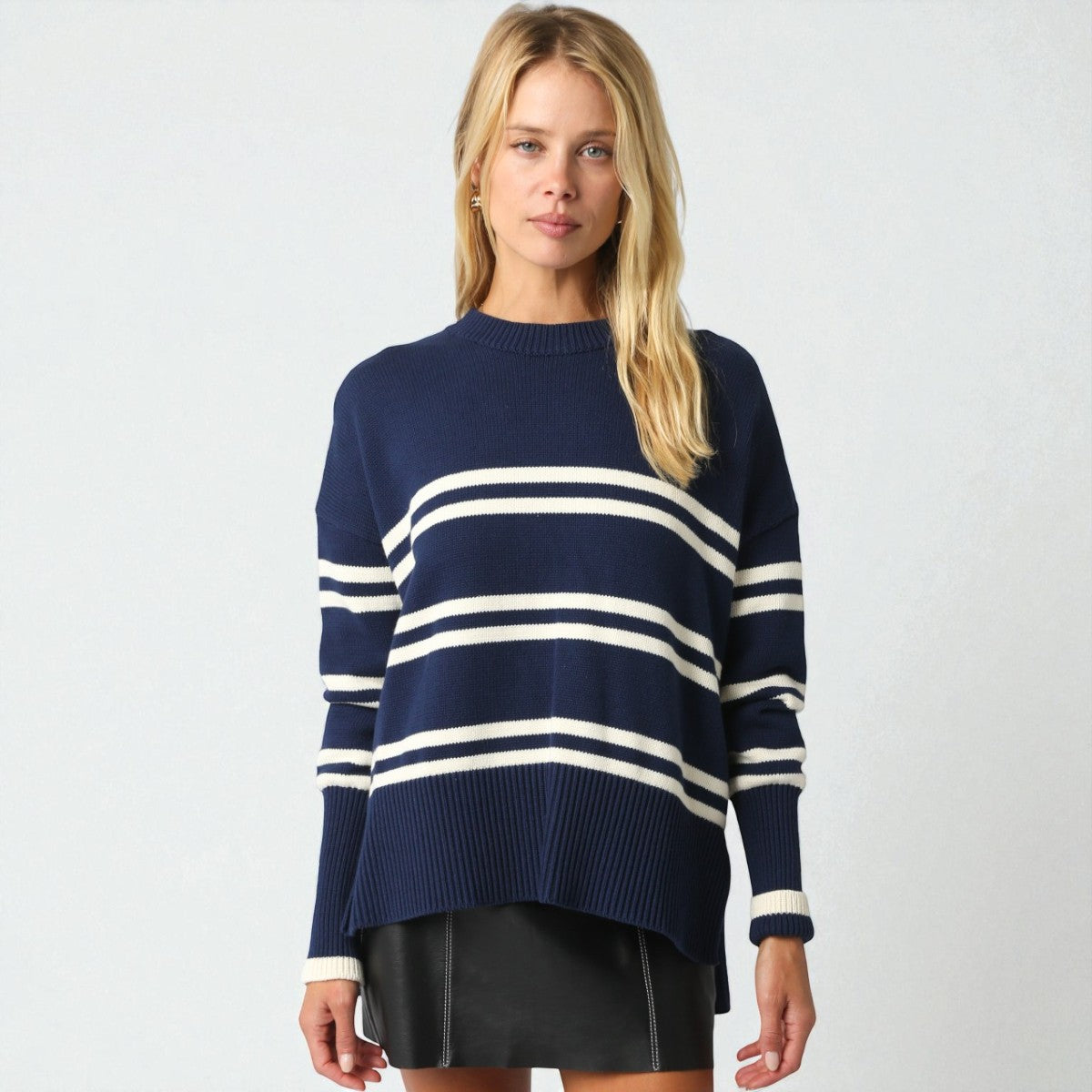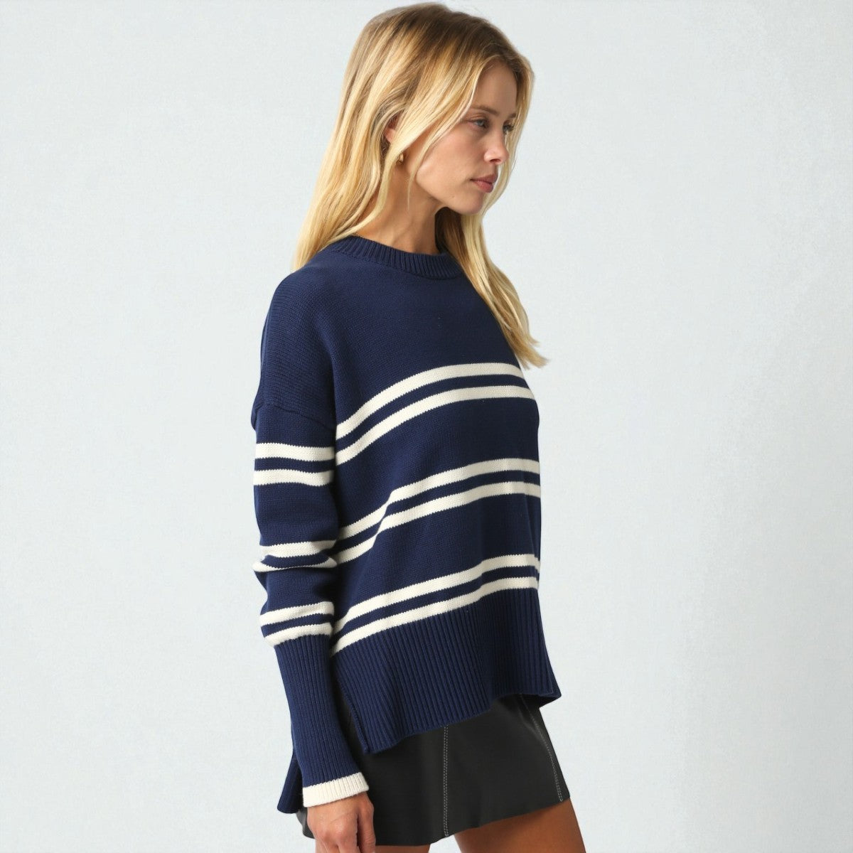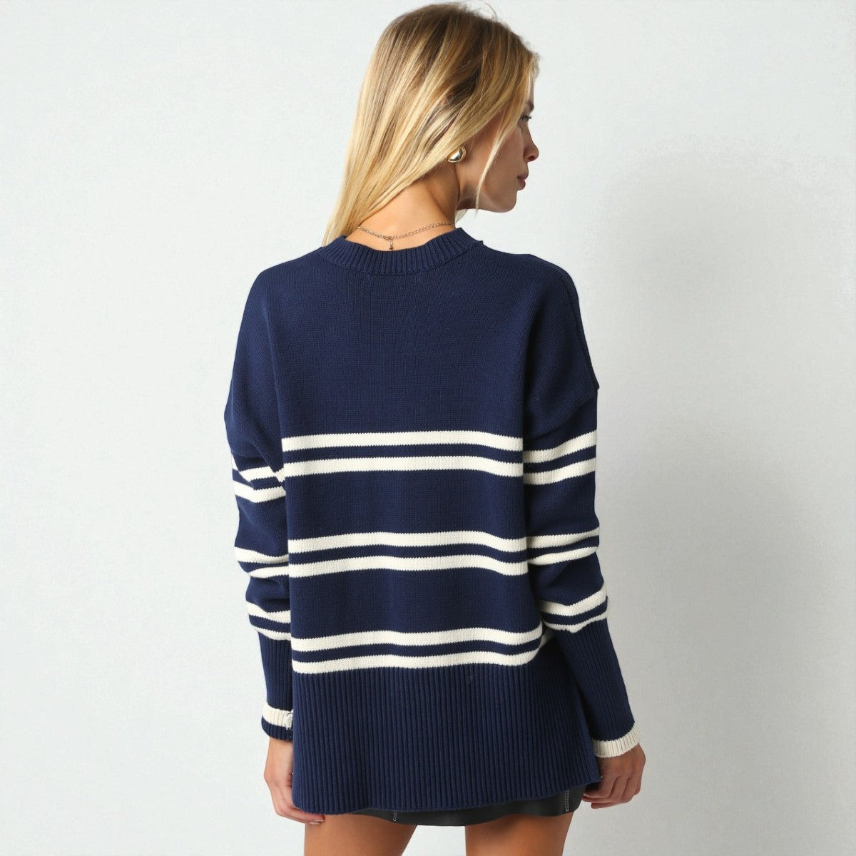 Suéter de manga larga confeccionado con un elegante diseño de rayas que combina tonos azules para un look versátil y refinado. Su cuello redondo clásico y ajuste cómodo lo hacen perfecto para cualquier ocasión.