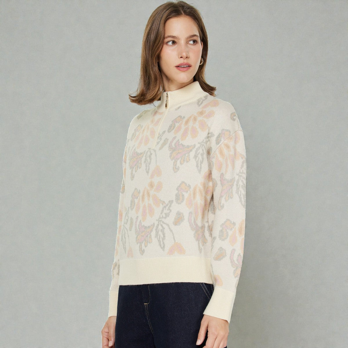 Suéter de manga larga en tono beige que combina comodidad y elegancia. Diseñado con un sofisticado cierre de cremallera en el cuello, permitiendo ajustar la prenda según tus preferencias.