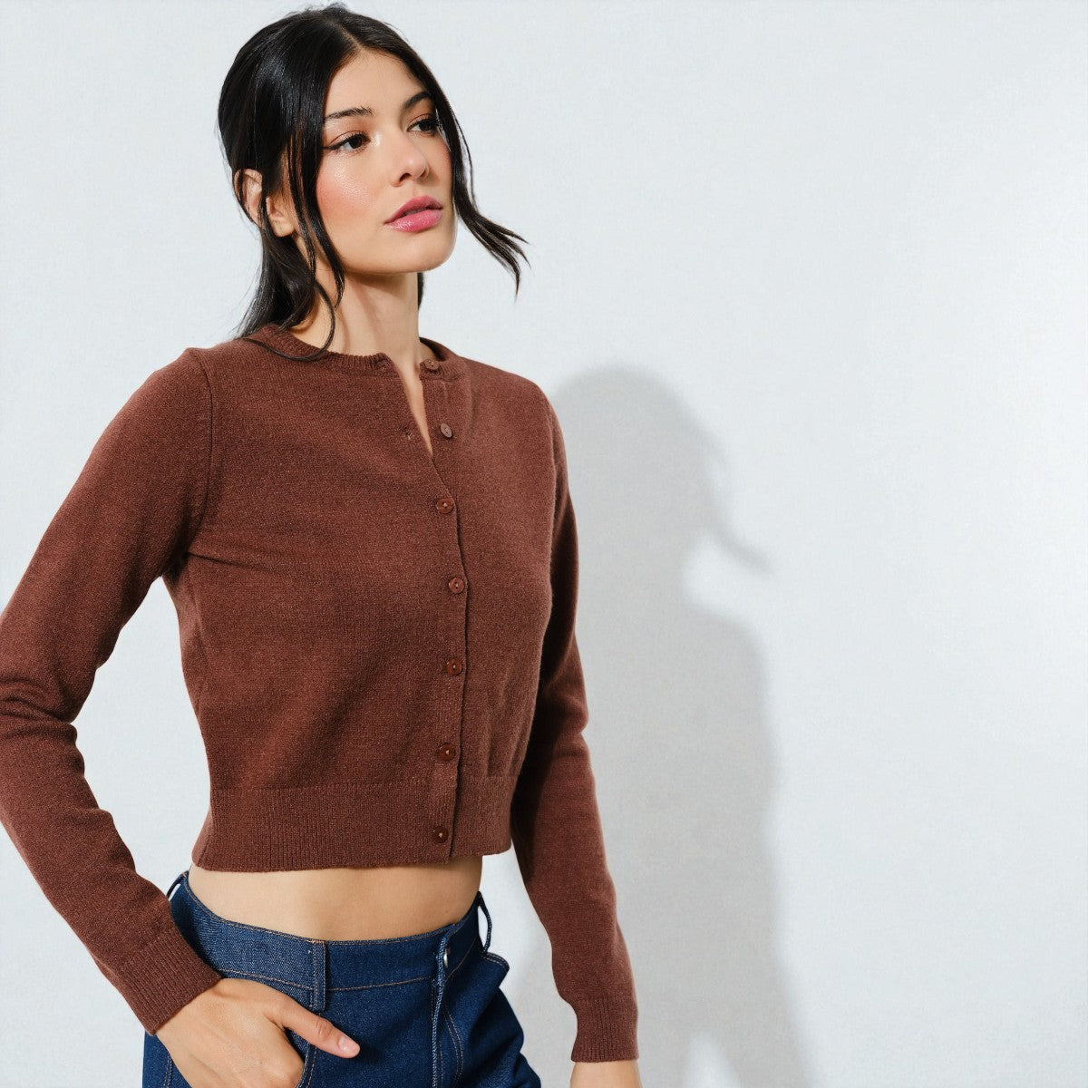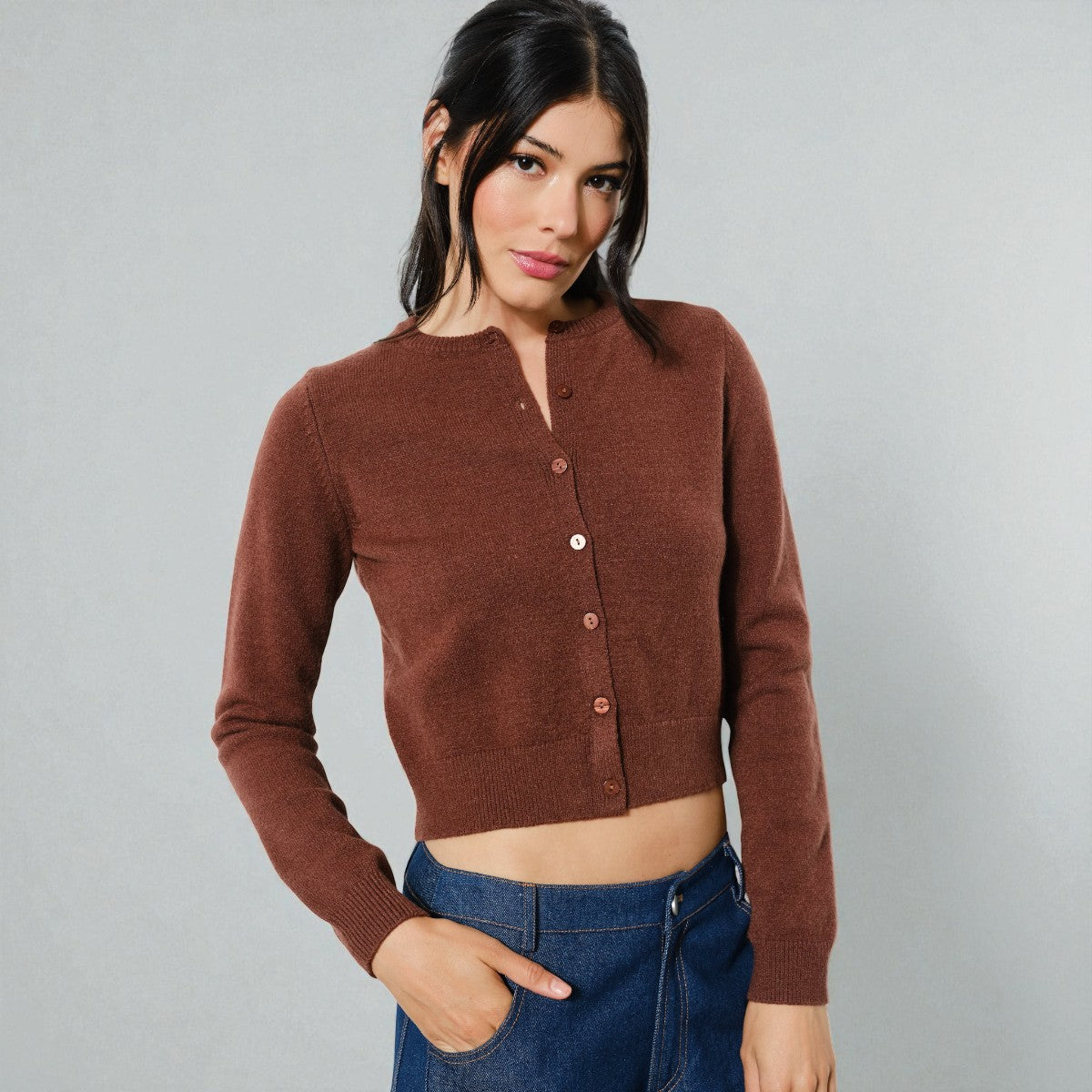 Suéter de corte minimalista confeccionado en tonos cálidos que combina elegancia discreta con funcionalidad. Diseño de manga larga con cierre de botones al frente que permite ajustar la prenda según tus necesidades. Su largo acortado lo convierte en una pieza versátil ideal para capas o usar solo.