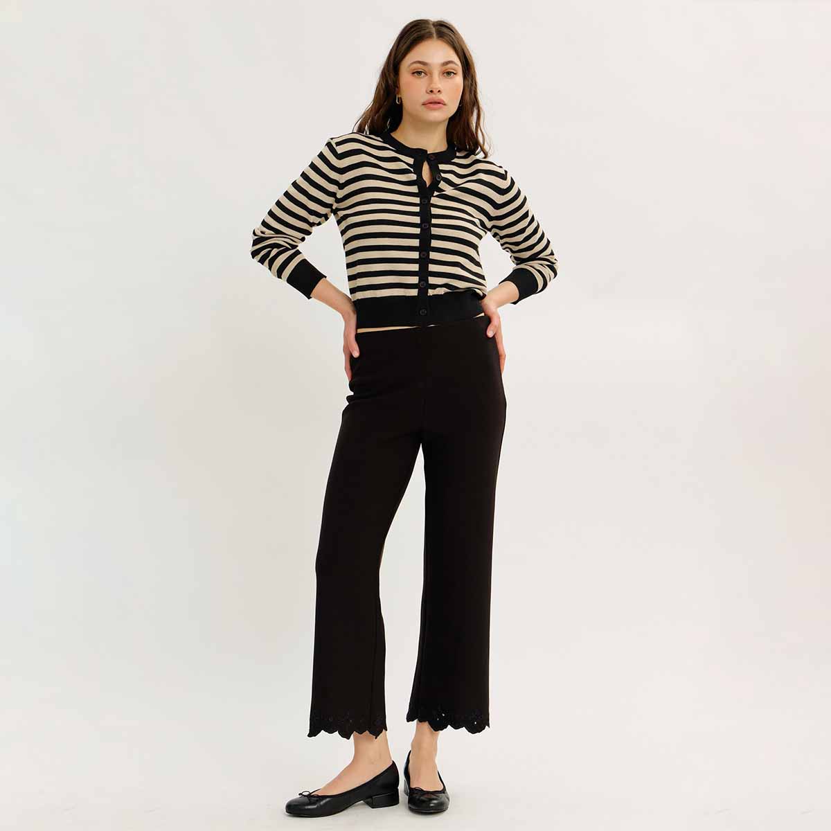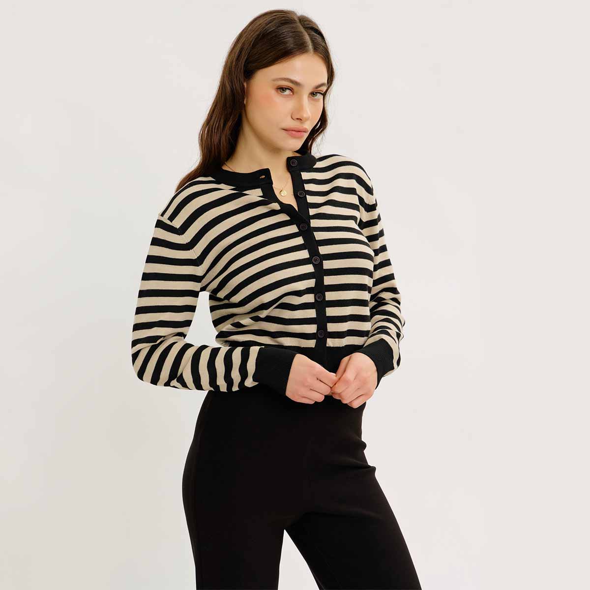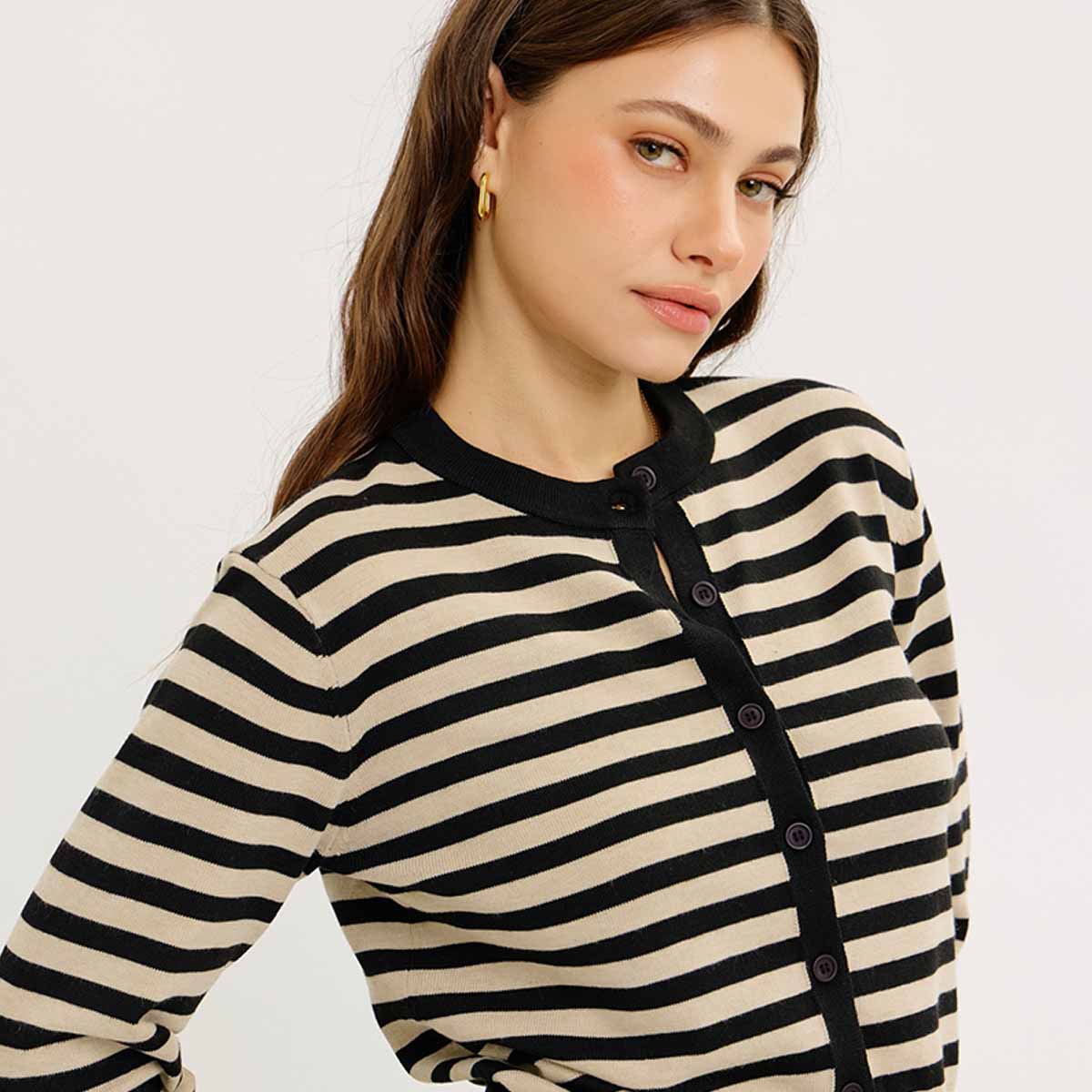 Suéter de rayas combina elegancia y comodidad, ideal para un look casual pero refinado. Su cierre con botones añade un toque clásico que facilita su uso, mientras que el diseño de rayas aporta un estilo moderno y versátil.