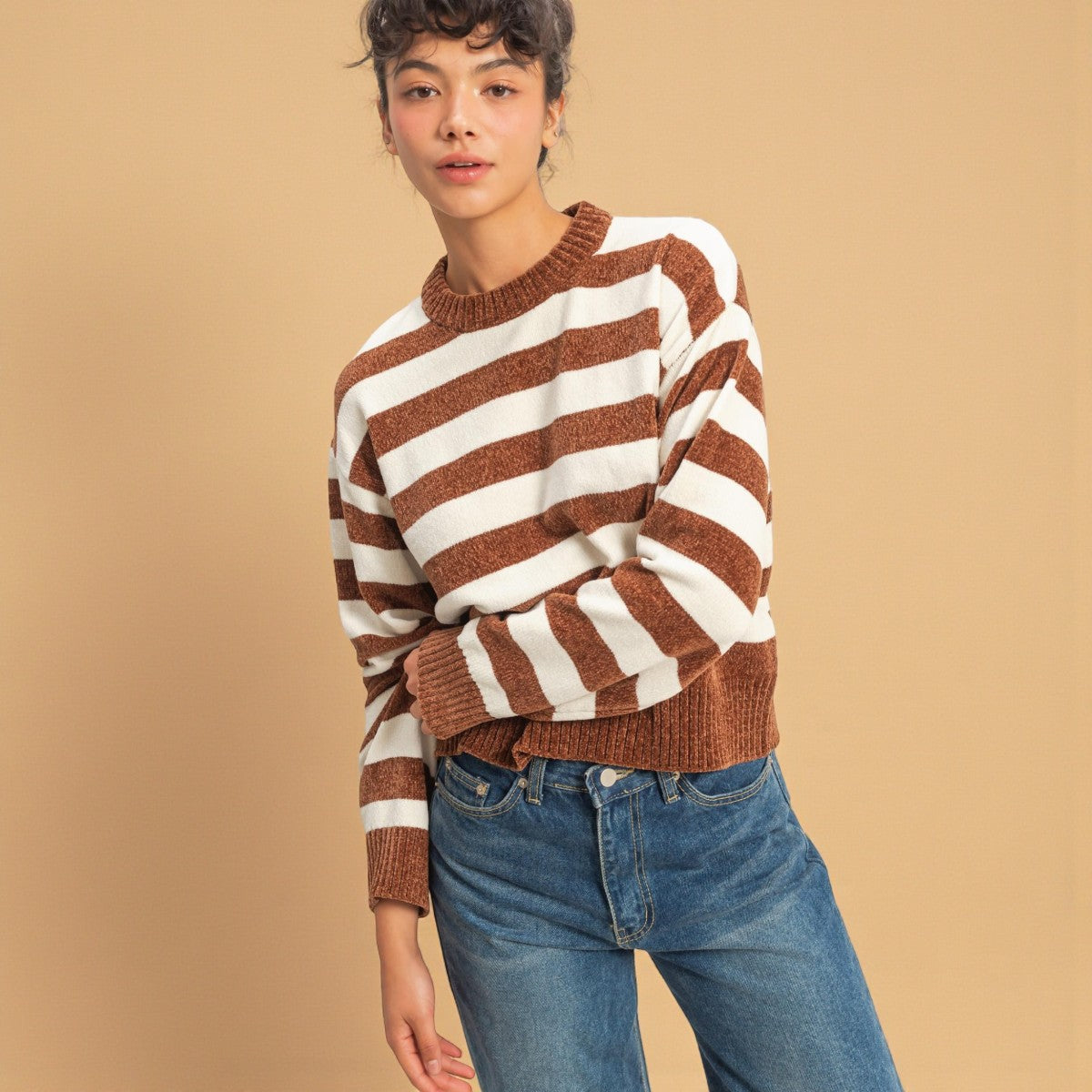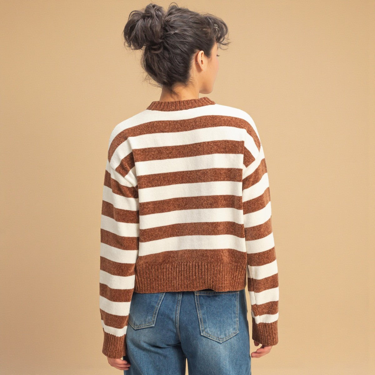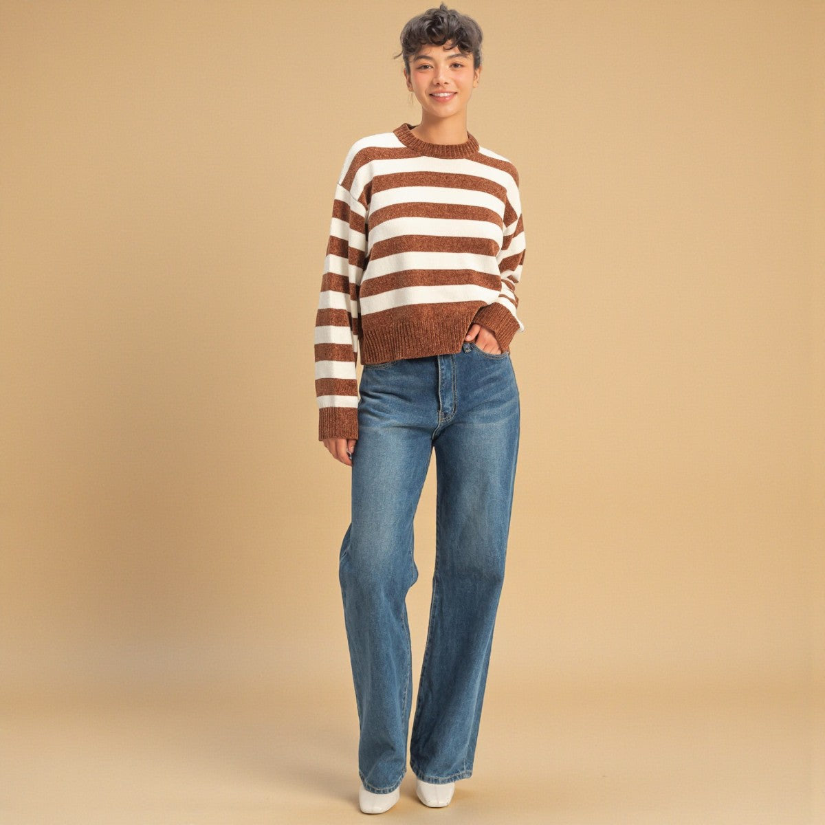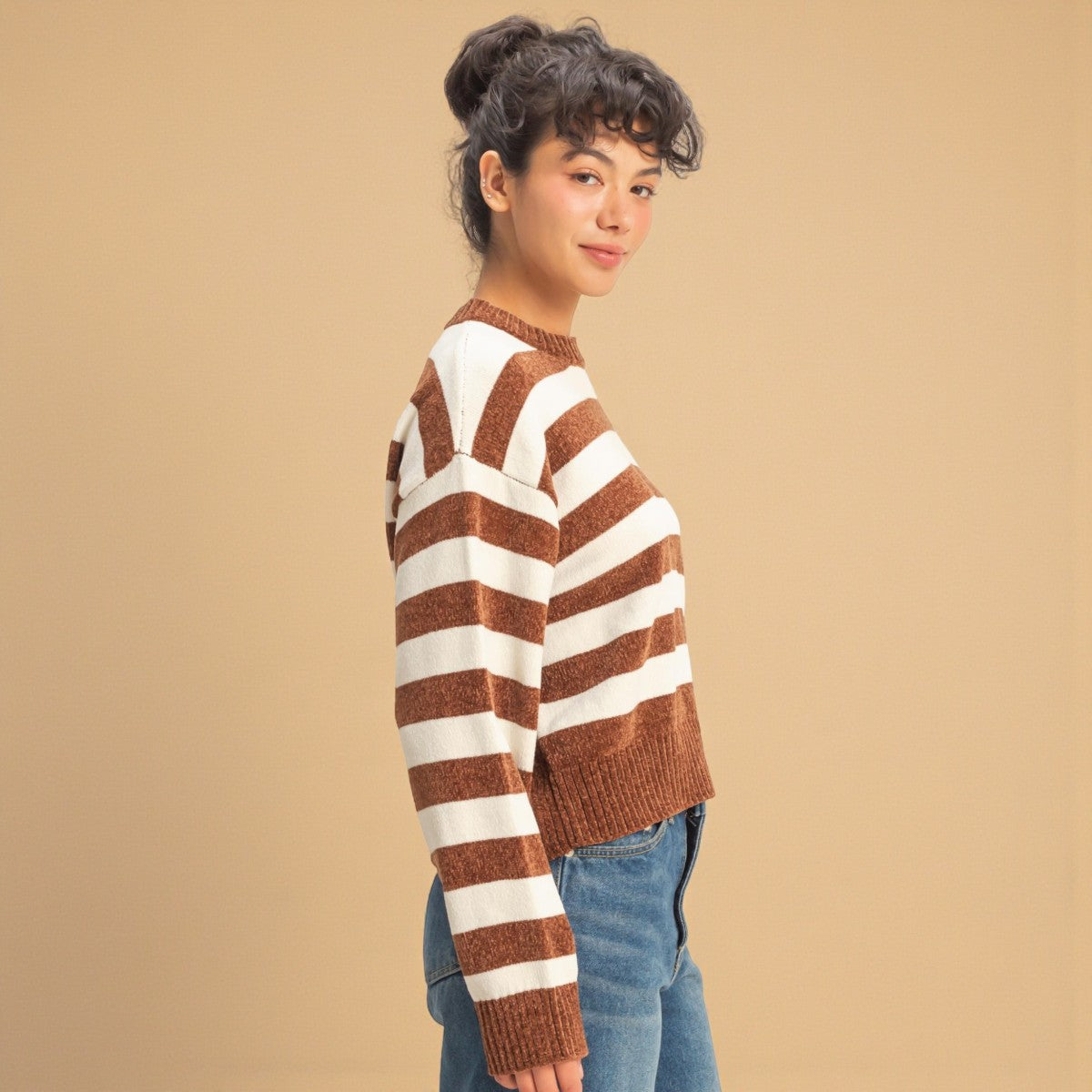 Suéter de corte elegante confeccionado en tela suave y acogedora, diseñado con rayas que le otorgan un toque clásico y versátil. Cuenta con cuello redondo que proporciona comodidad y manga larga ideal para las estaciones más frías.