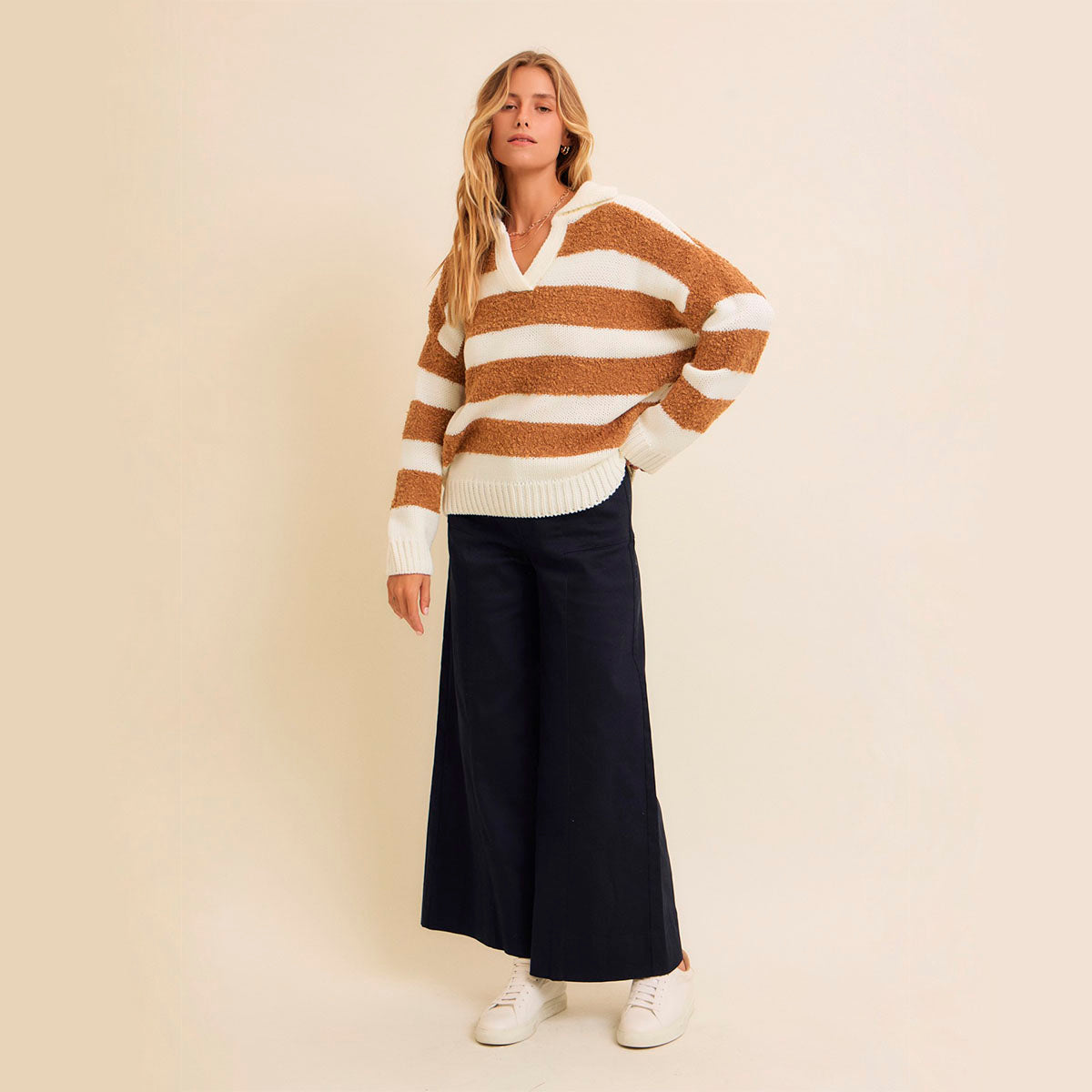 Sueter con un estampado en rayas, cuello en v y mangas largas. Ideal para que luzcas sensasional esta temporada.
