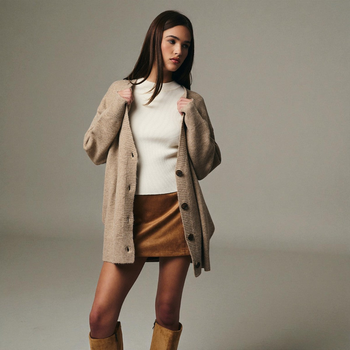 Suéter de corte alargado en tono camel que combina elegancia y comodidad. Confeccionado con cierre frontal de botones y mangas largas que proporcionan calidez y versatilidad. Su diseño clásico lo convierte en un básico imprescindible que trasciende las tendencias de temporada.
