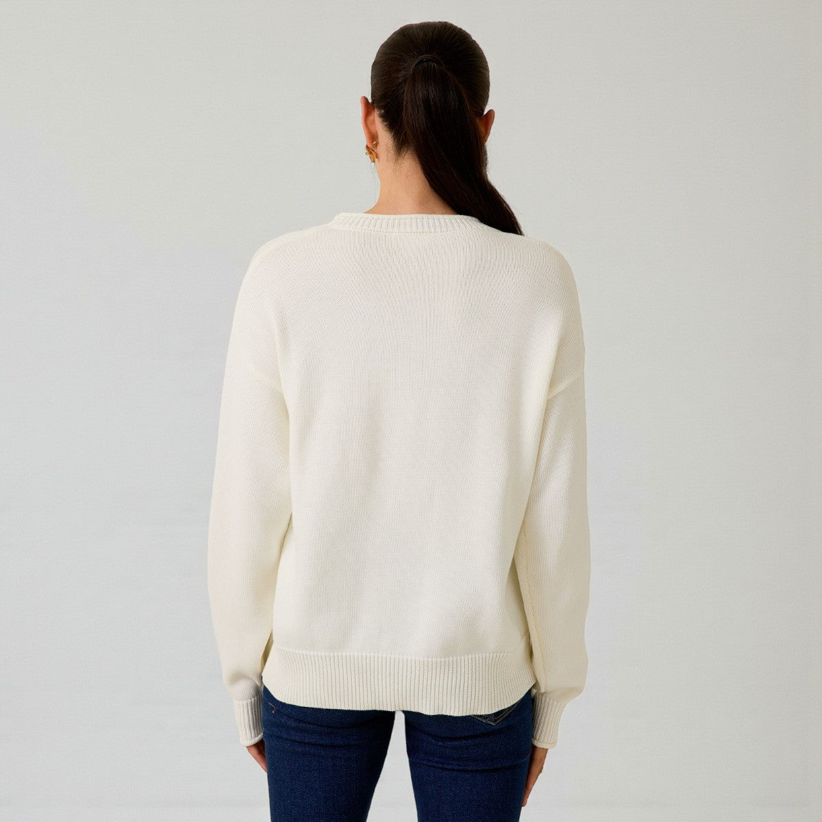 Suéter de manga larga confeccionado en tonos neutros con cuello redondo clásico. Destaca por su estampado frontal que añade carácter y personalidad a un diseño versátil.