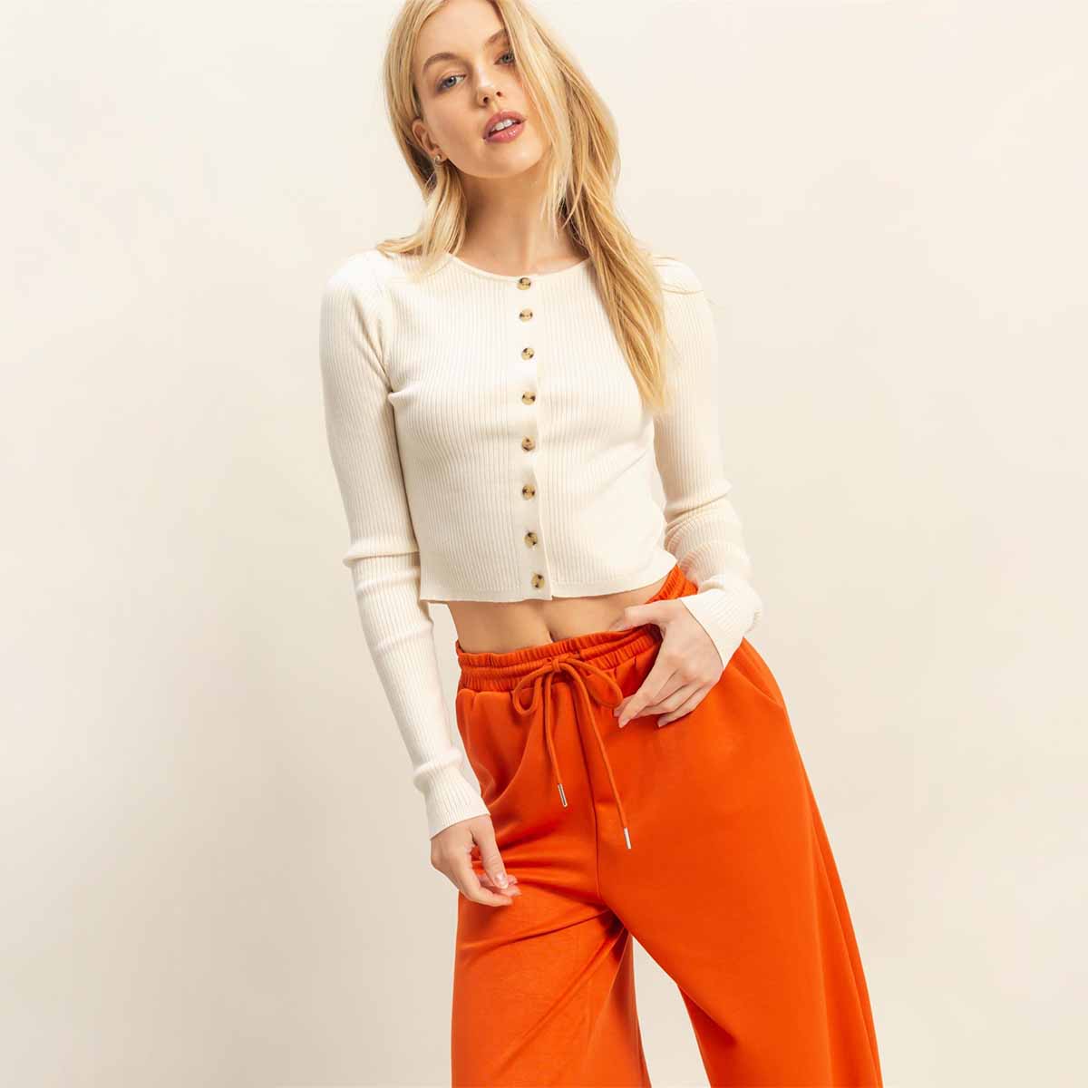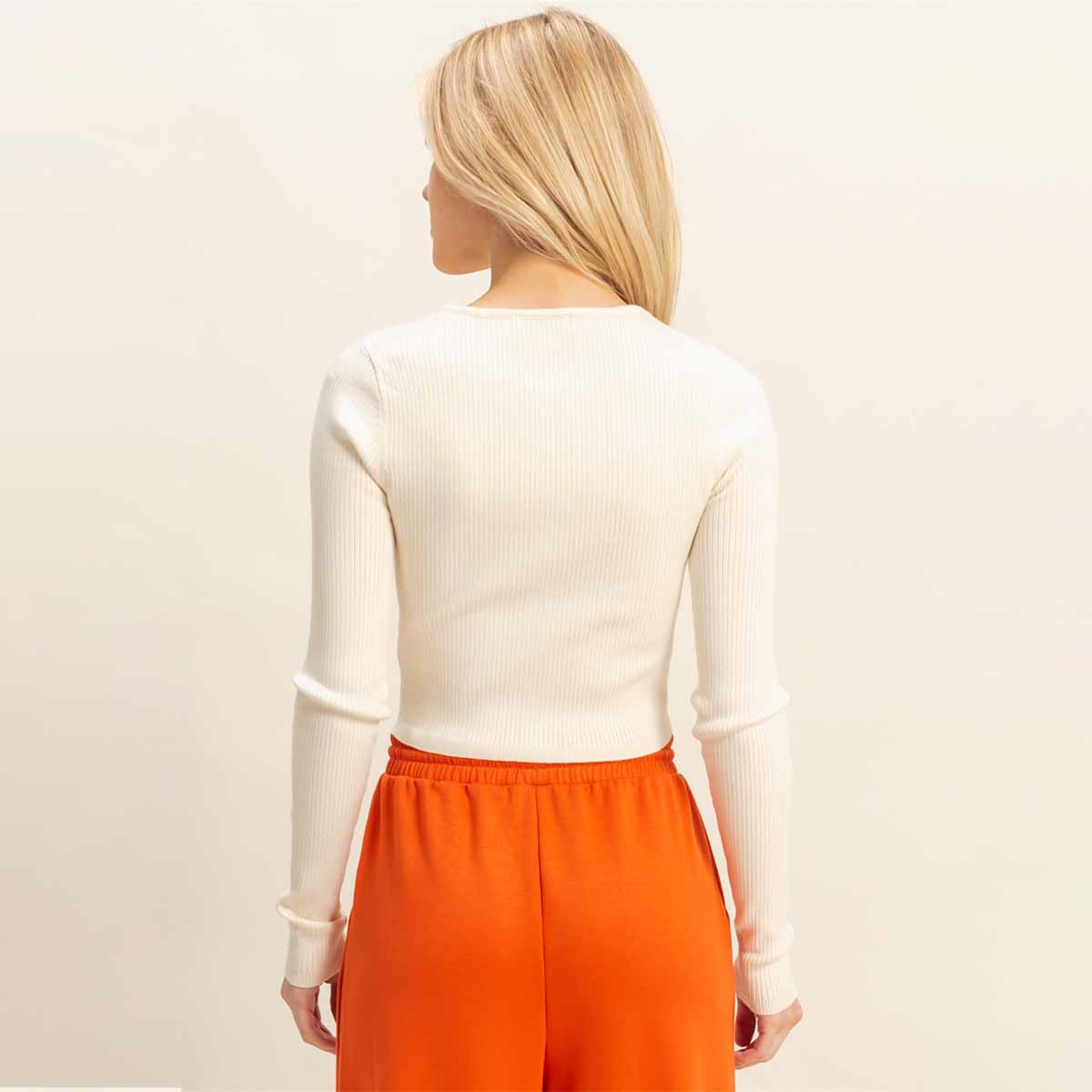 Este suéter de punto acanalado combina textura y diseño funcional, ofreciendo un ajuste cómodo y favorecedor. Los botones permiten un cierre adaptable, facilitando su uso y aportando un toque clásico.