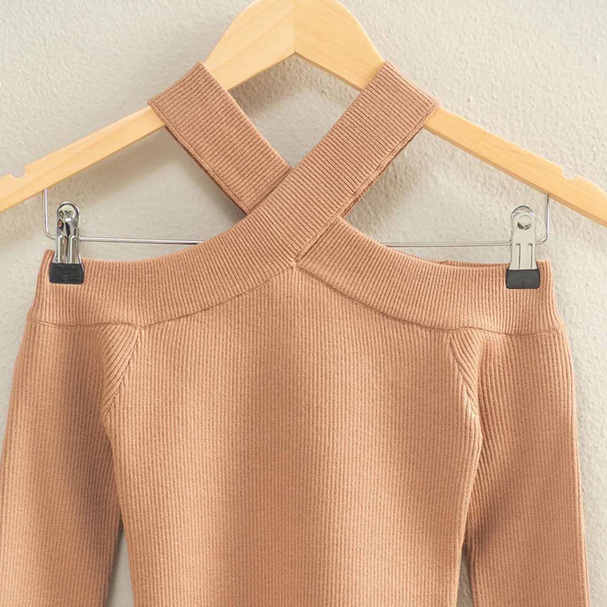 Este suéter ajustado de punto acanalado combina elegancia y comodidad con un diseño exclusivo de cuello cruzado que realza el escote y añade un detalle sofisticado. Sus hombros descubiertos aportan un toque moderno y femenino, resaltando la silueta con un acabado ceñido que se adapta perfectamente al cuerpo.