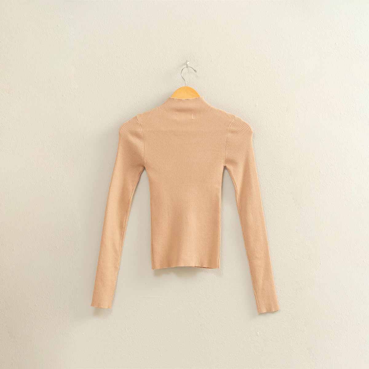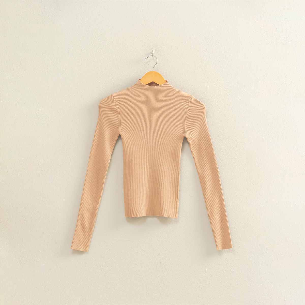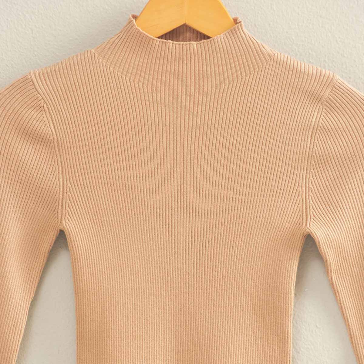 Este suéter de cuello alto acanalado combina un corte entallado y elegante que realza la figura, ofreciendo un ajuste sofisticado. Su escote alto proporciona calidez y estilo, mientras que las mangas largas aseguran comodidad en climas frescos.