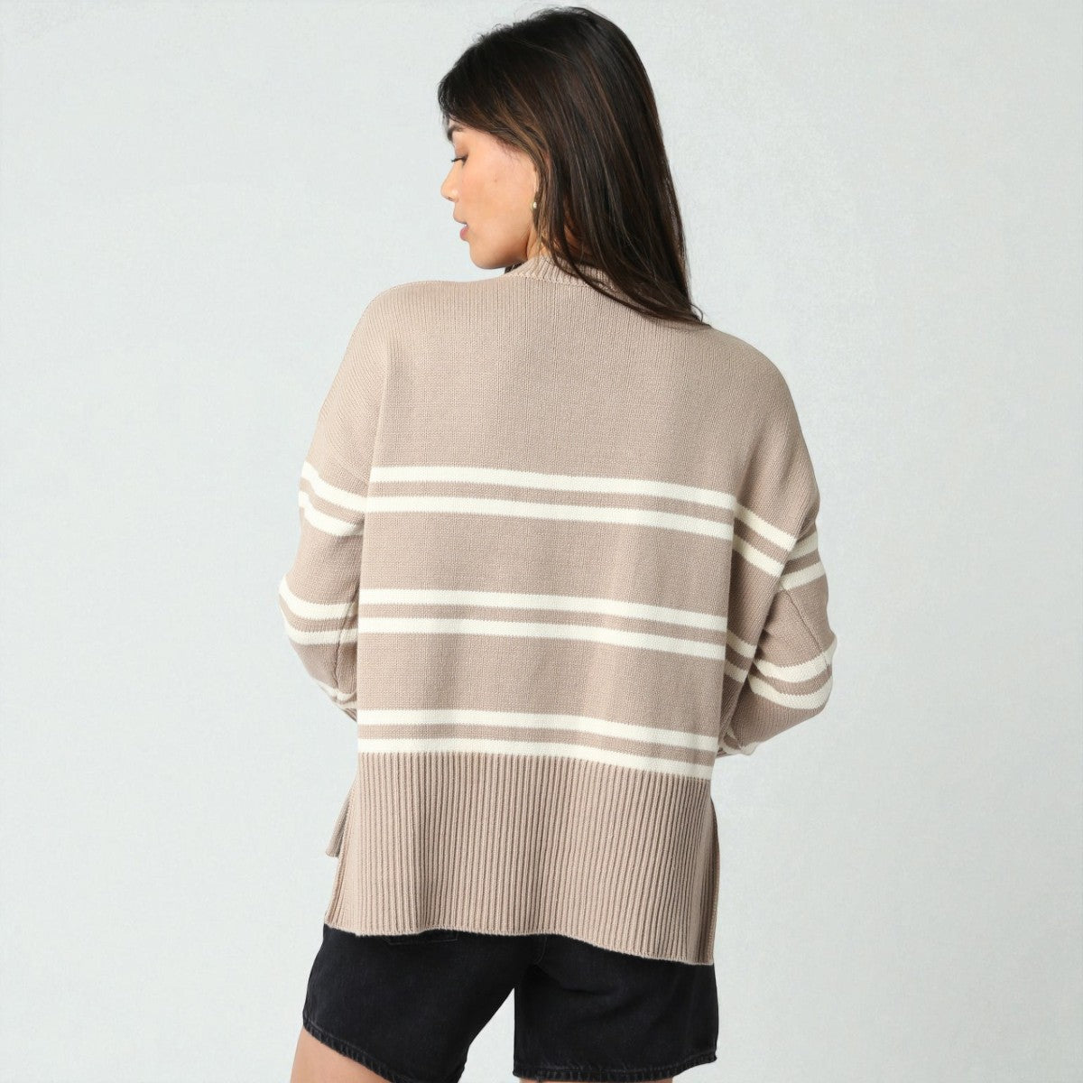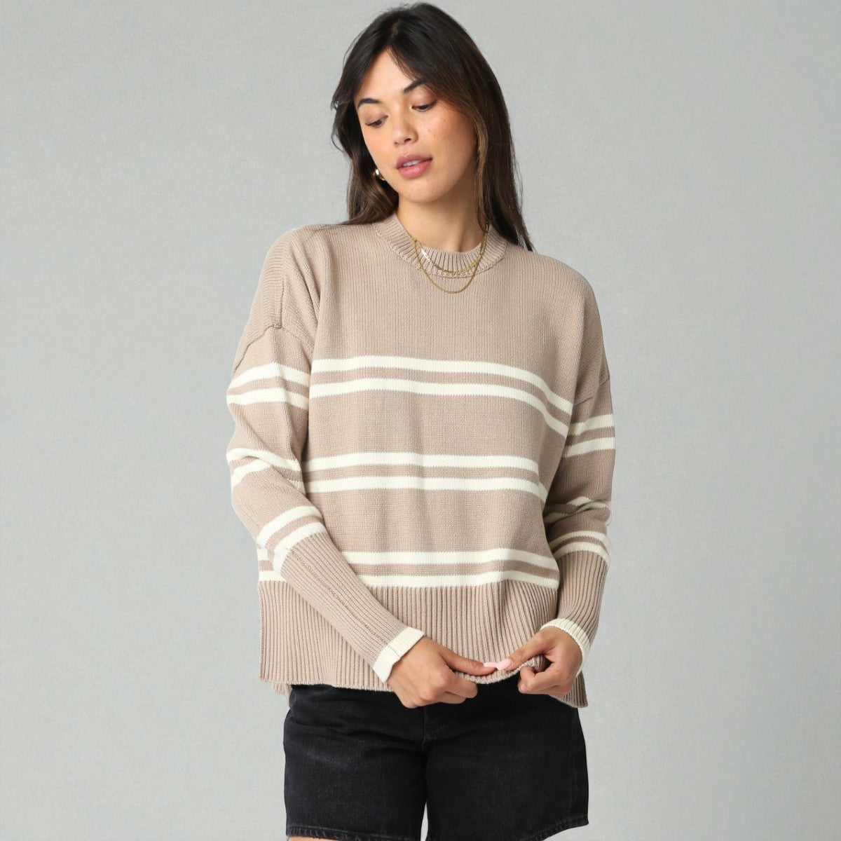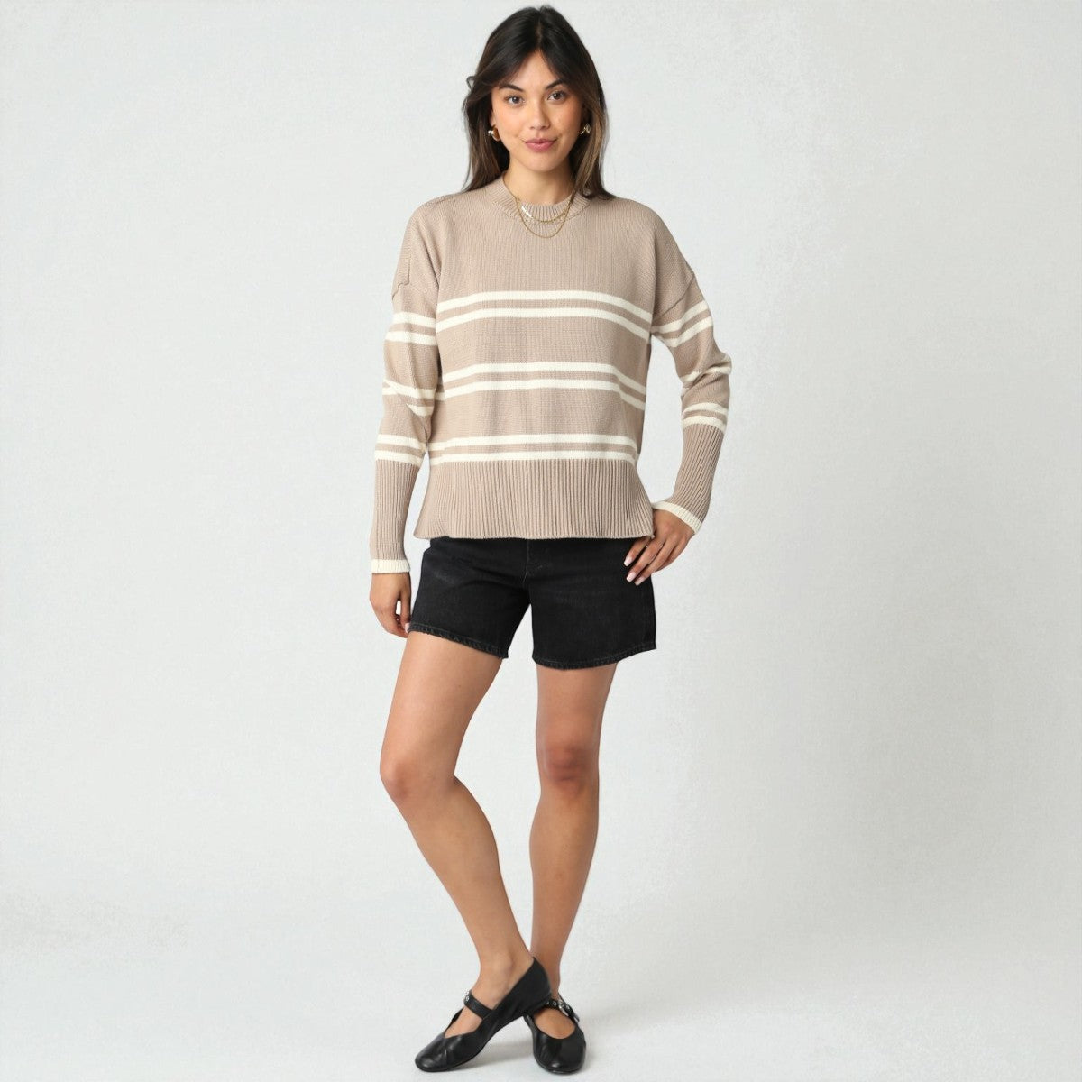 Suéter de manga larga confeccionado con un elegante diseño de rayas que combina tonos azules para un look versátil y refinado. Su cuello redondo clásico y ajuste cómodo lo hacen perfecto para cualquier ocasión.