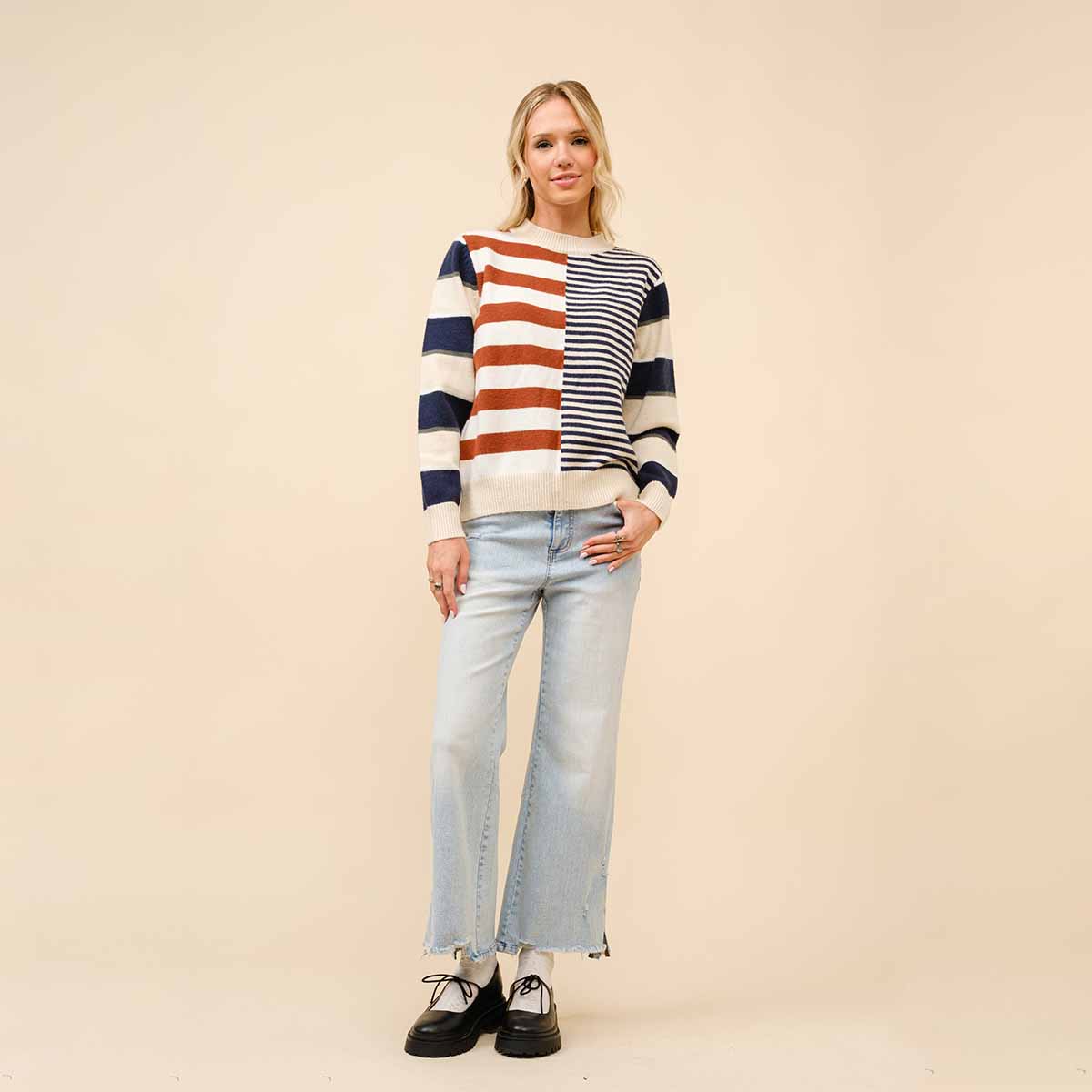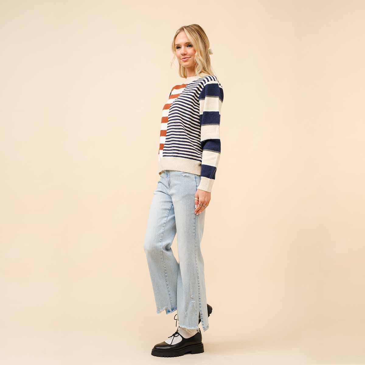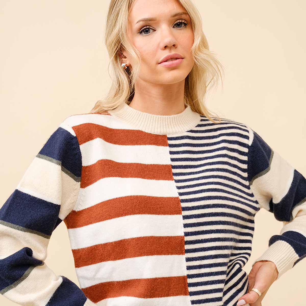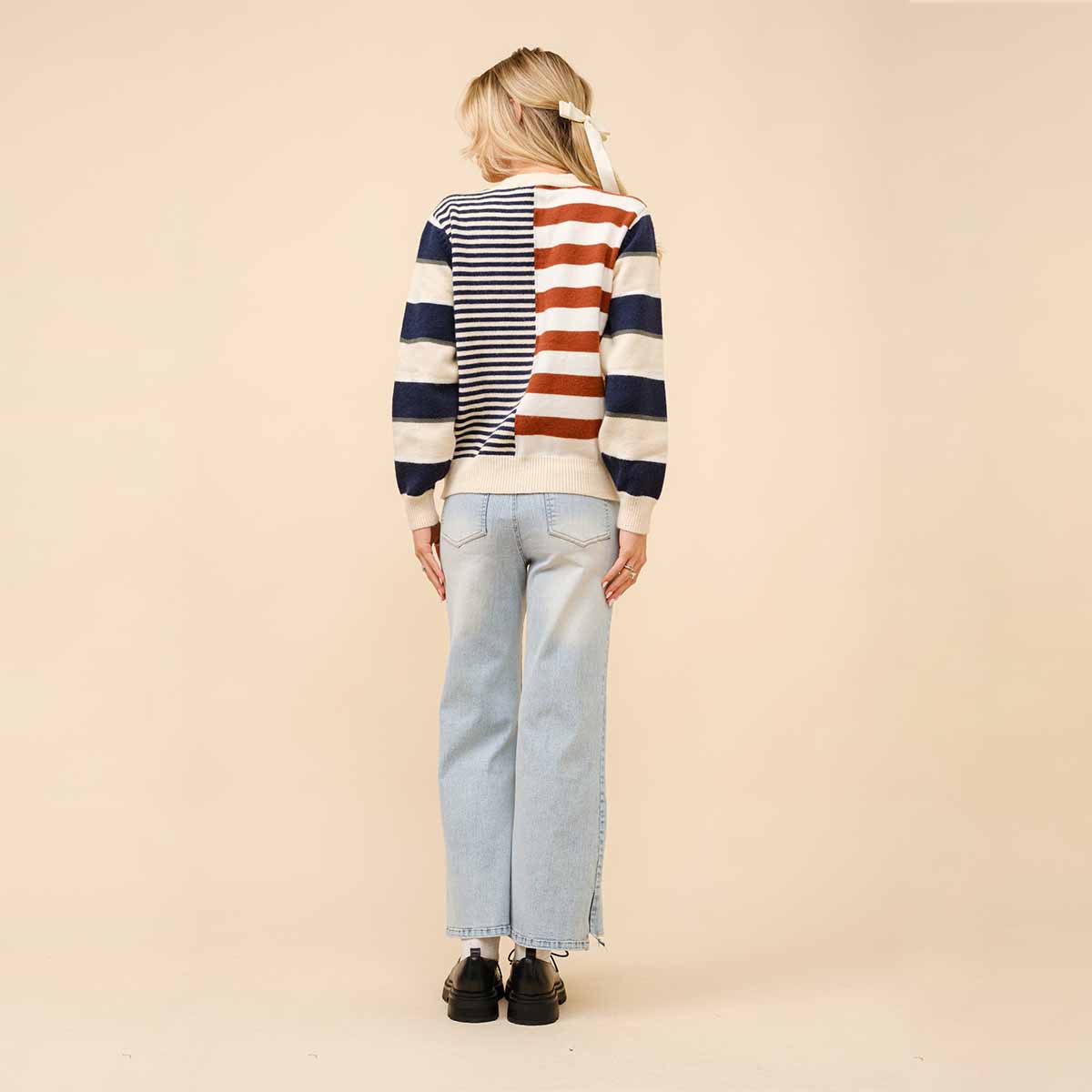 Sueter con cuello redondo combina sofisticación y estilo a través de su patrón de rayas en diferentes grosores y tonalidades. Su diseño único añade un toque moderno y distintivo a cualquier atuendo, ideal para quienes buscan comodidad sin renunciar a la elegancia.