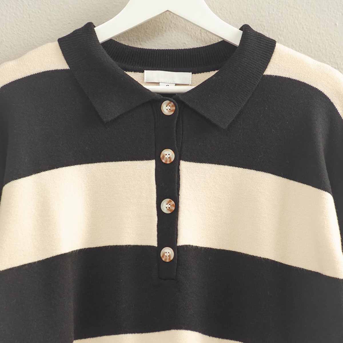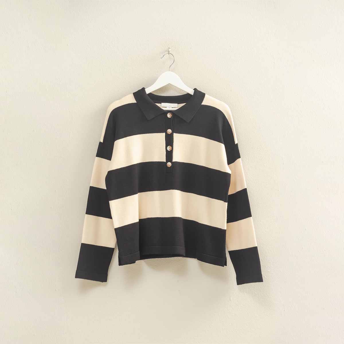 Suéter de rayas combina elegancia y comodidad, diseñado con cuellos que cuentan con botones para un toque distinguido. Su tejido ligero lo hace ideal para llevarlo en cualquier ocasión, aportando sofisticación sin renunciar a la practicidad y el confort.