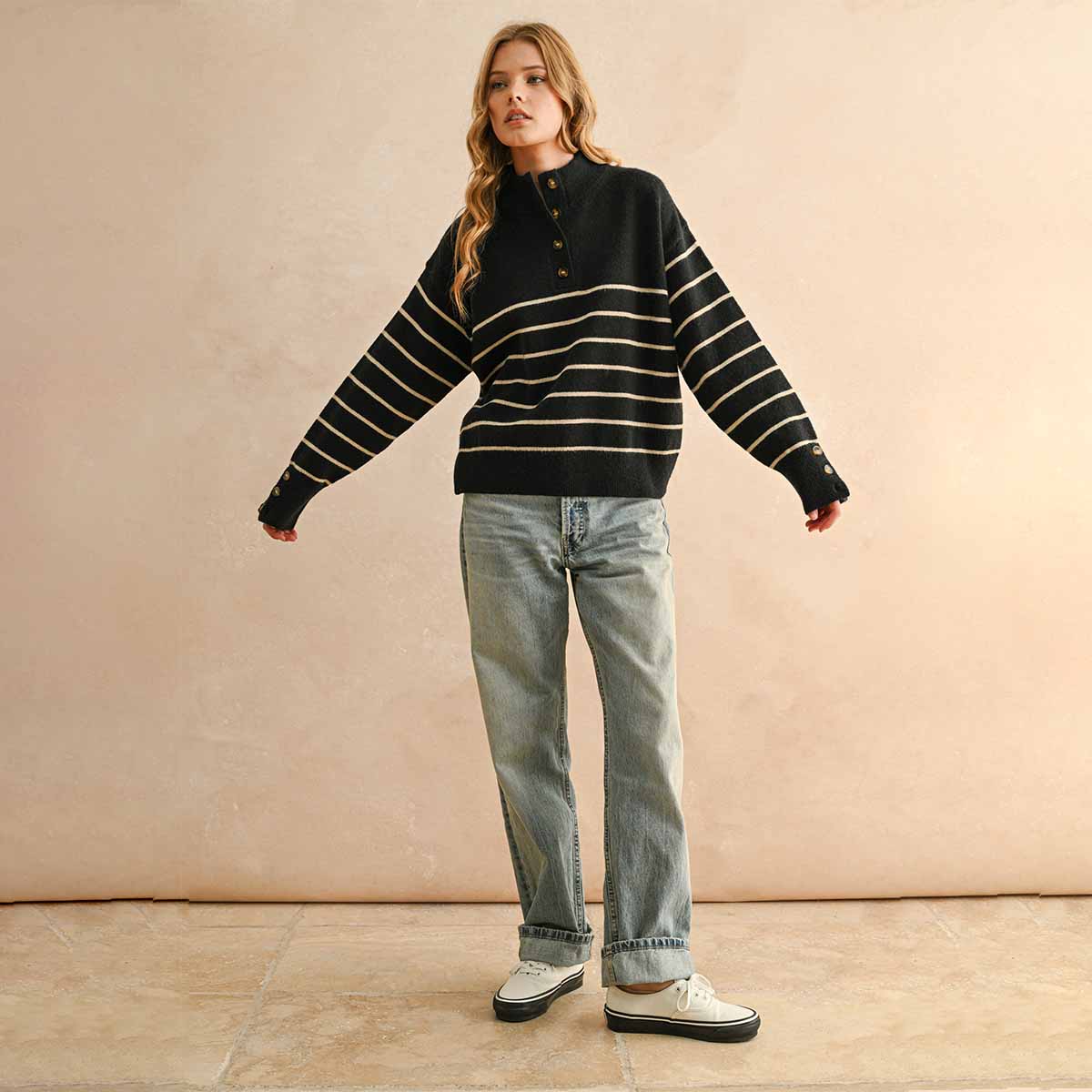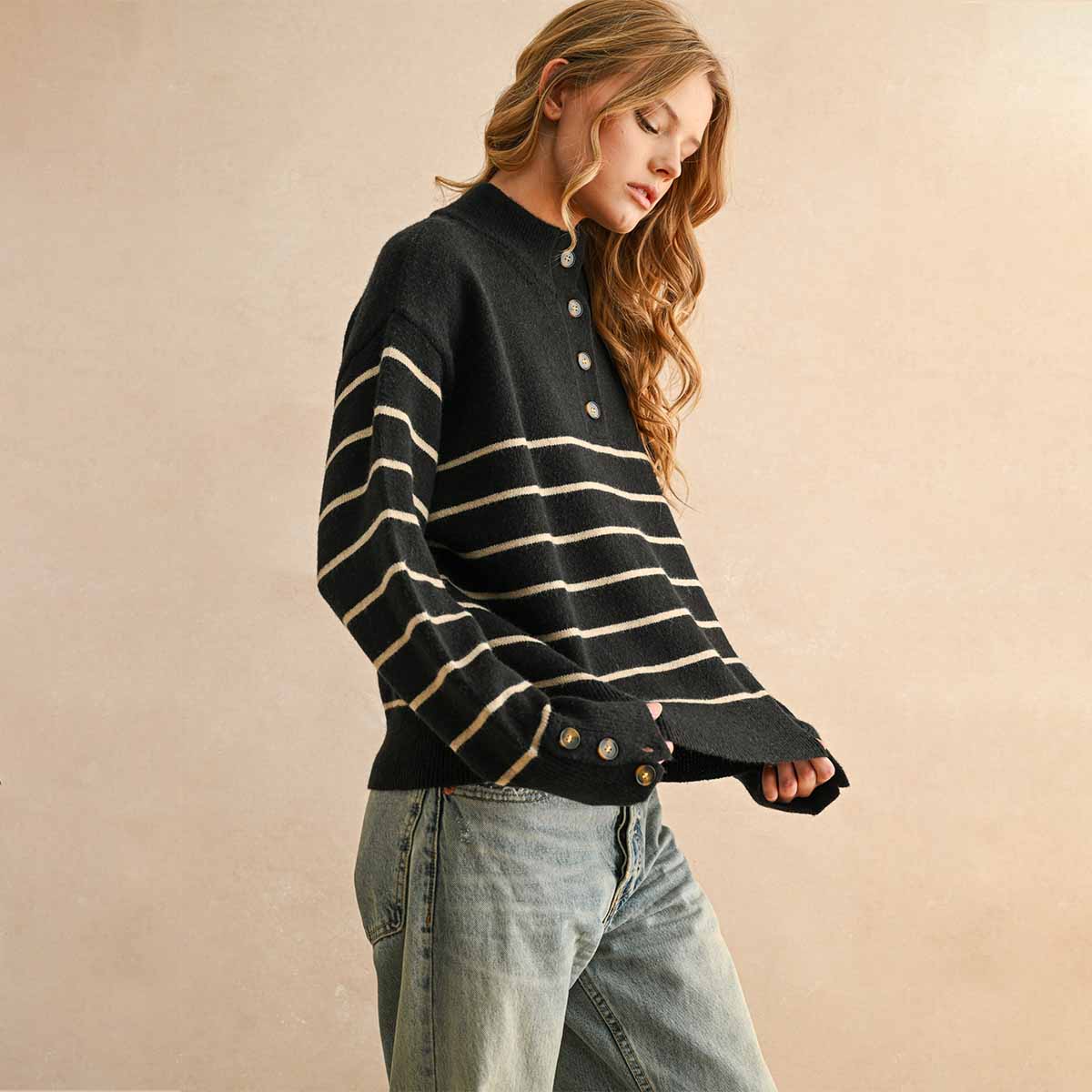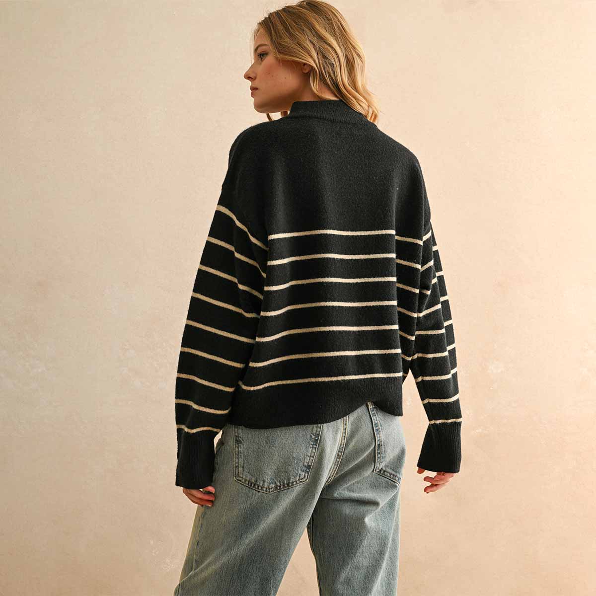 Suéter de rayas delgadas combina elegancia y comodidad, ideal para quienes buscan un estilo refinado sin sacrificar la ligereza. Su diseño con botones en el cuello brinda un detalle sofisticado que permite ajustar el look a diferentes ocasiones.