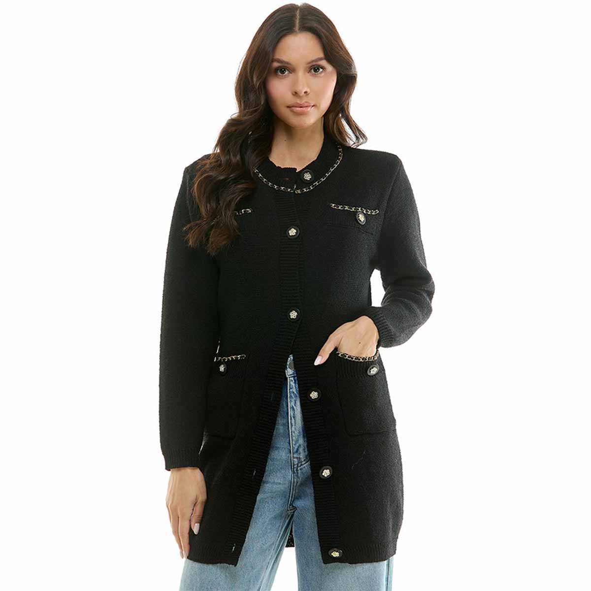 Suéter negro de manga larga combina elegancia y funcionalidad con sus detalles dorados que realzan cualquier look. Su cierre con botones permite un ajuste cómodo y versátil, mientras que los bolsillos frontales ofrecen practicidad sin sacrificar el estilo.