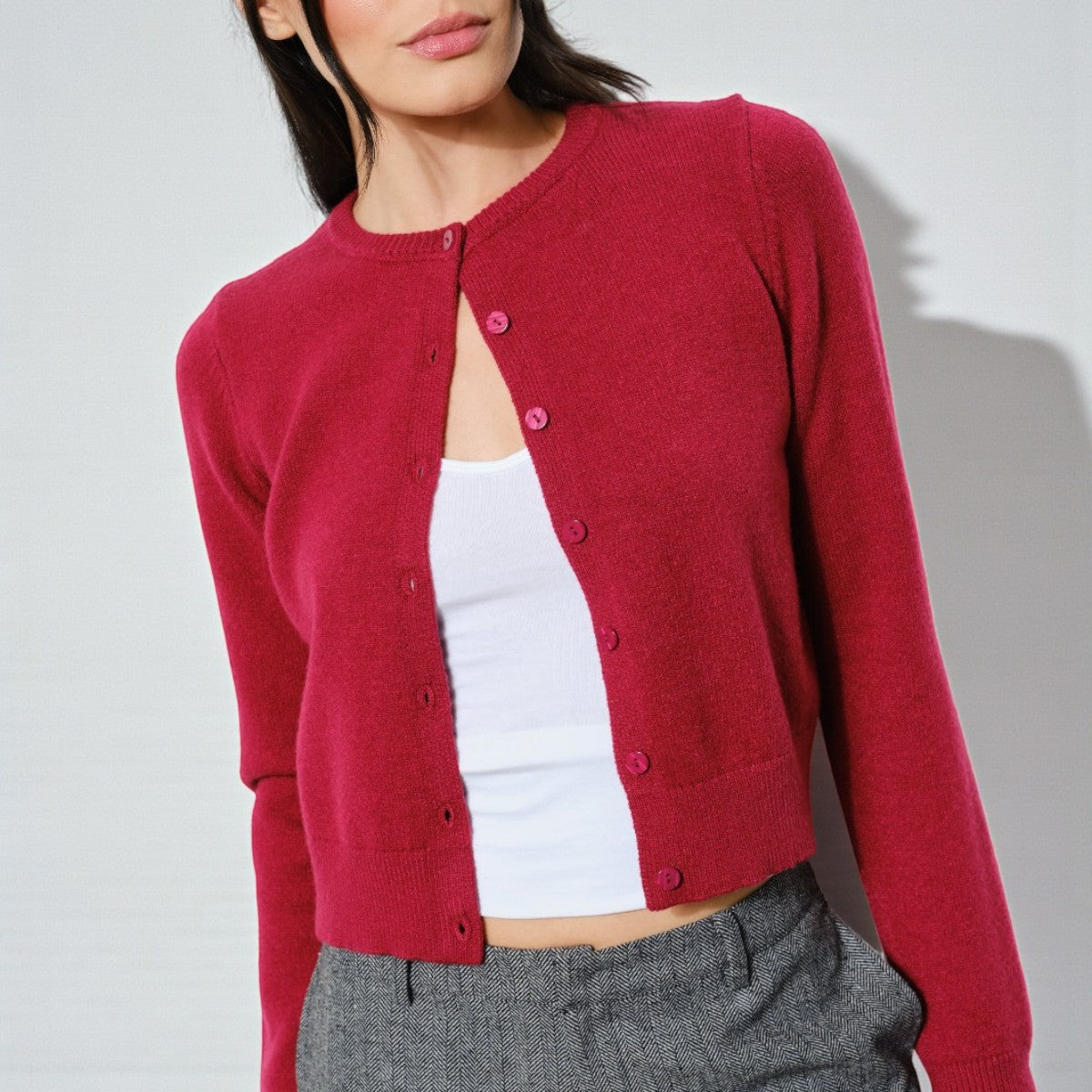 Suéter de corte minimalista confeccionado en tonos cálidos que combina elegancia discreta con funcionalidad. Diseño de manga larga con cierre de botones al frente que permite ajustar la prenda según tus necesidades. Su largo acortado lo convierte en una pieza versátil ideal para capas o usar solo.