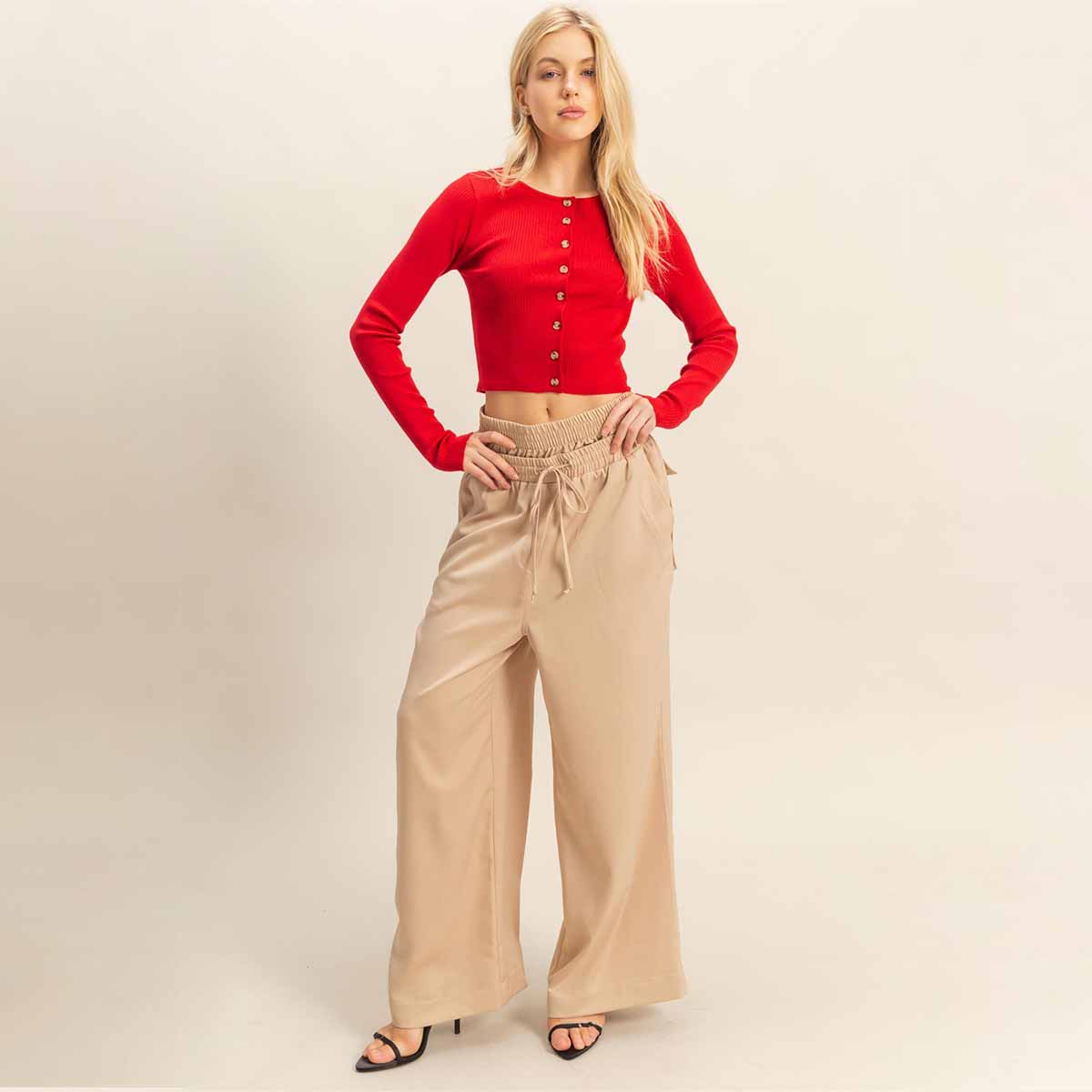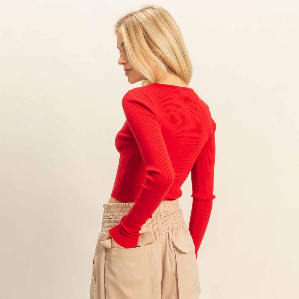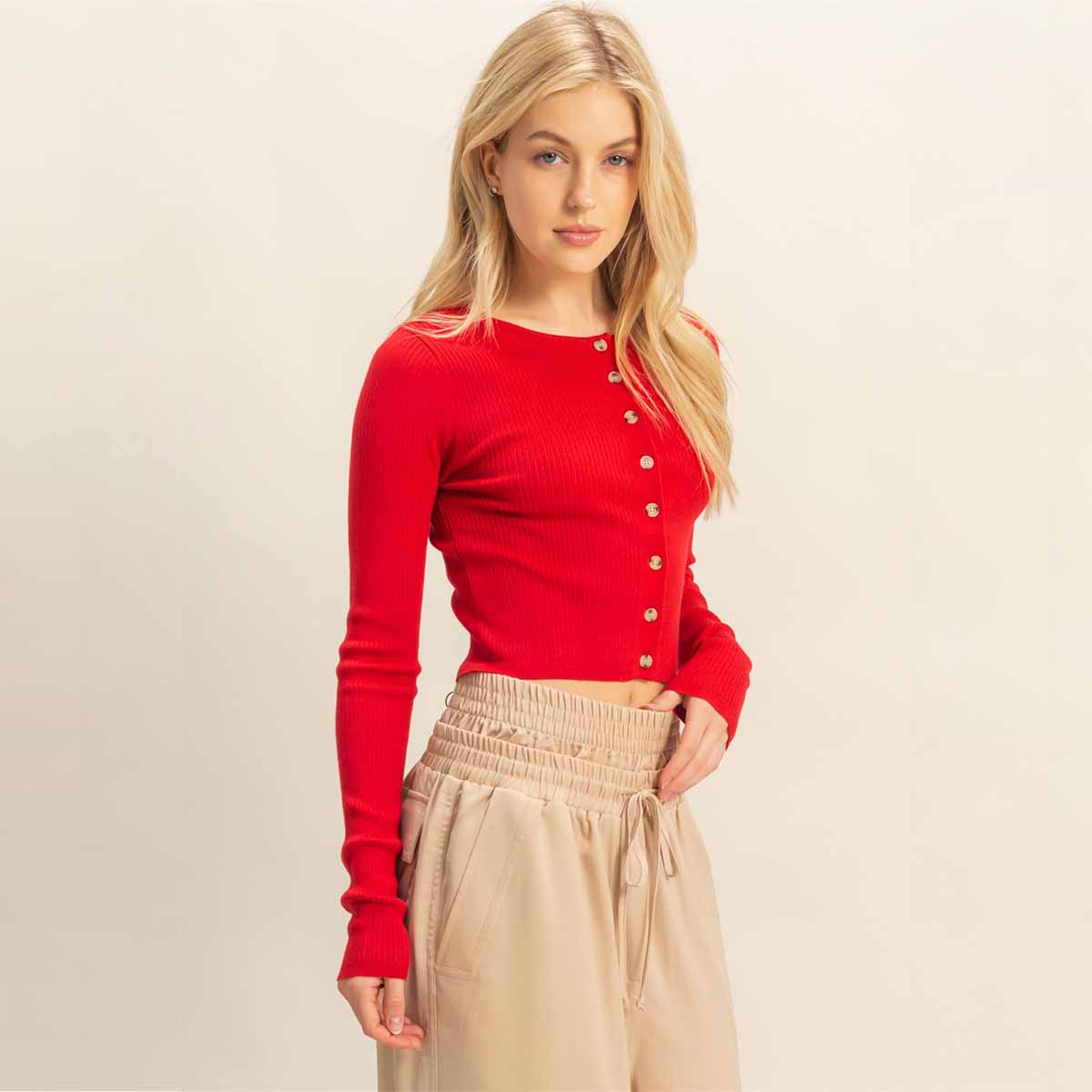 Este suéter de punto acanalado combina textura y diseño funcional, ofreciendo un ajuste cómodo y favorecedor. Los botones permiten un cierre adaptable, facilitando su uso y aportando un toque clásico.
