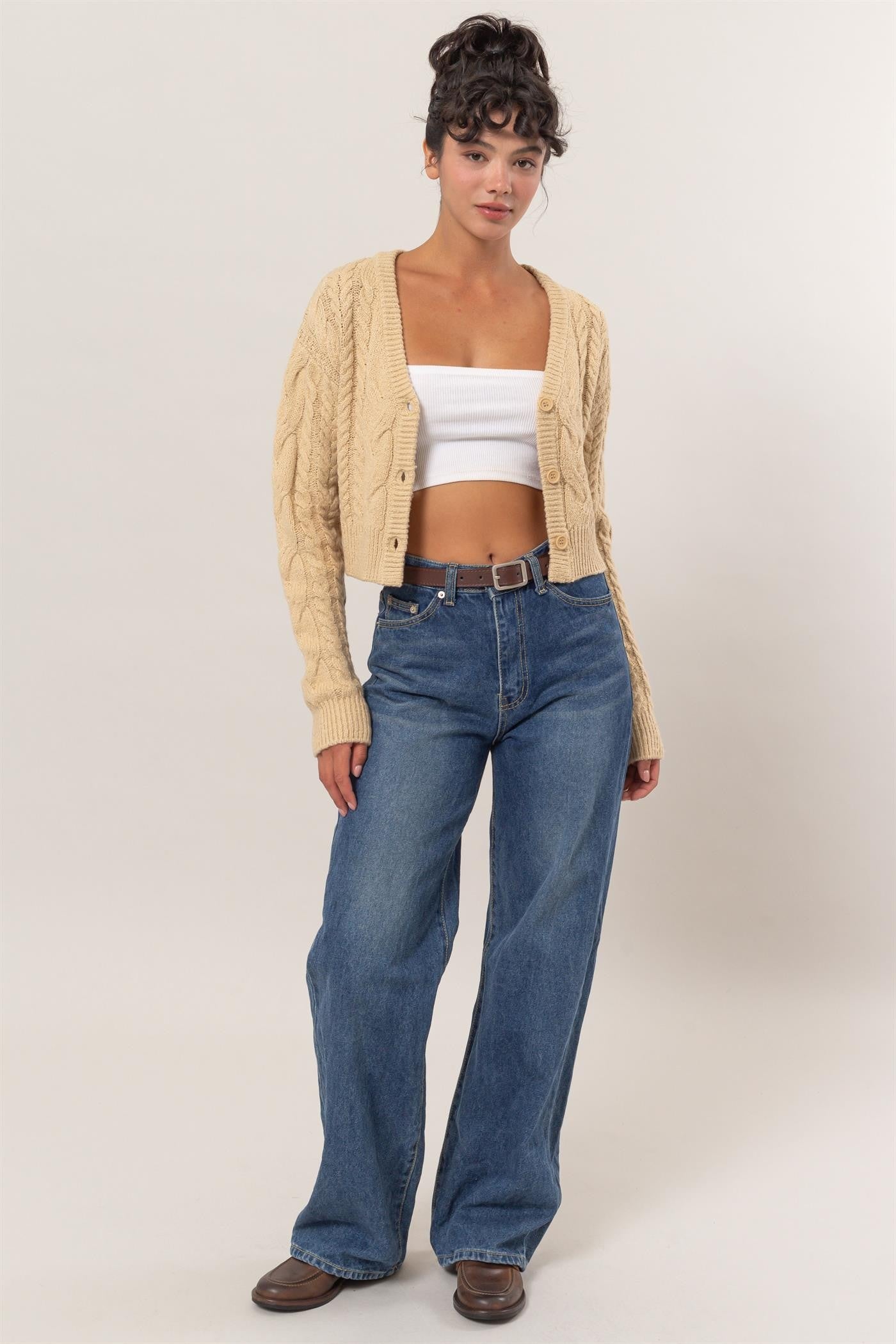 Este cárdigan corto fue diseñado para una chica relajada y sofisticada como tú. Su corpiño con botones en la parte delantera tiene un elegante escote en V y mangas largas con hombros caídos que aportan un toque de estilo. Sus detalles de punto trenzado en diferentes tamaños agregan textura y su ajuste ceñido al cuerpo te hará lucir elegante y chic.