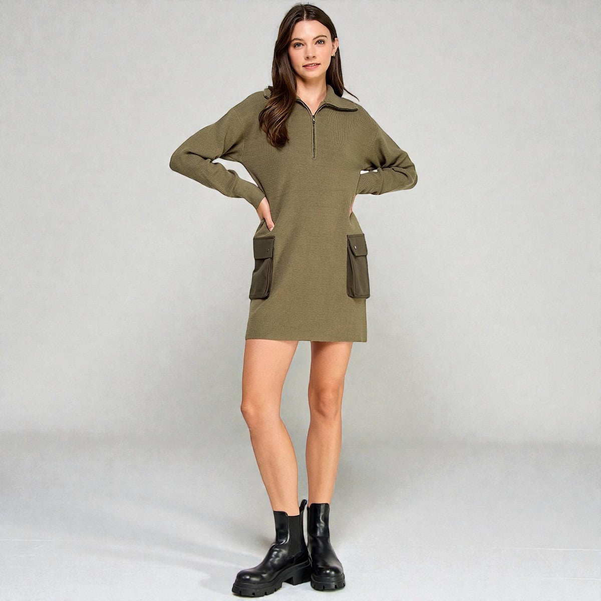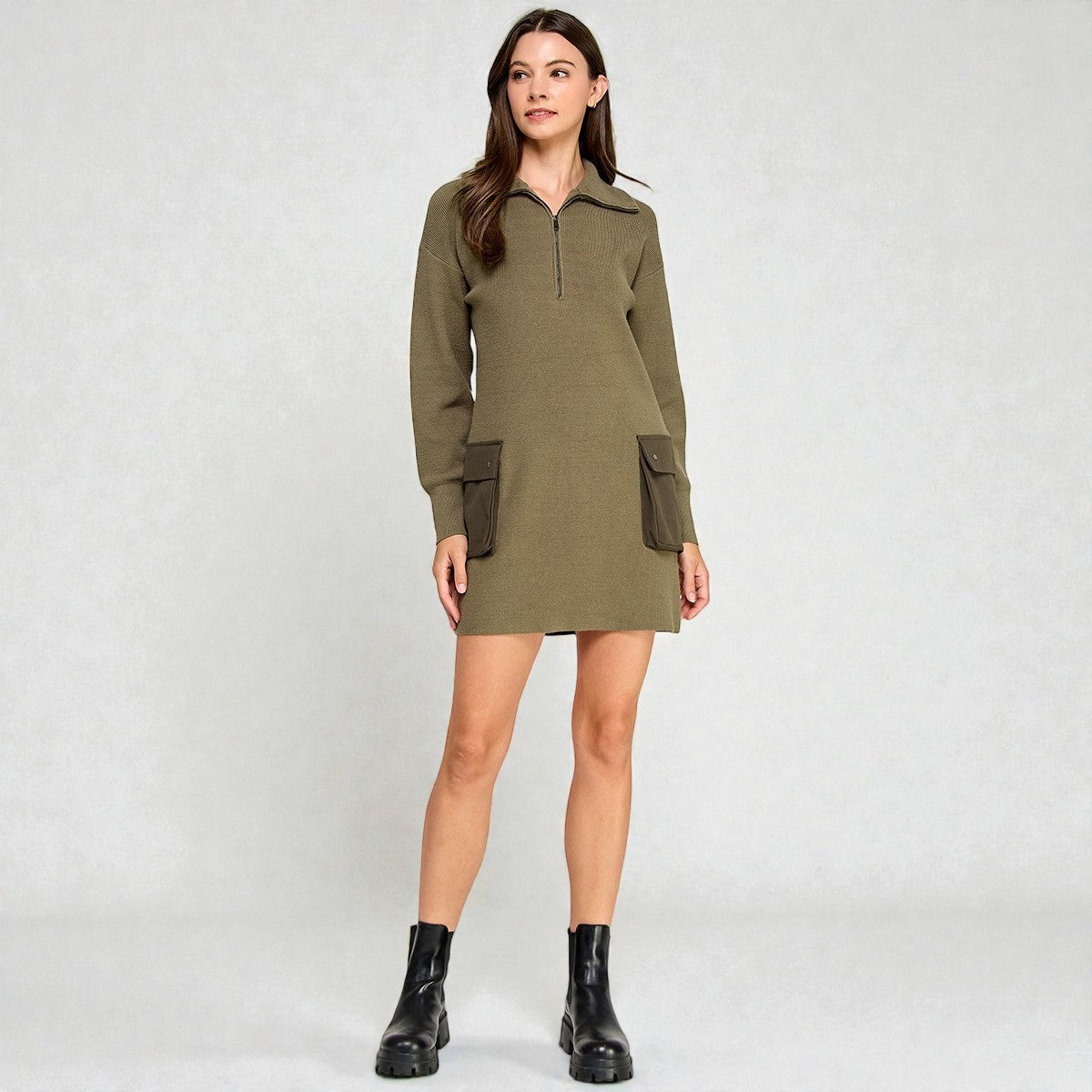 Vestido que combina elegancia y practicidad. Confeccionado en tela cómoda ideal para el uso diario, cuenta con mangas largas que proporcionan cobertura versátil. Destaca por su cierre con zipper en el cuello, un detalle moderno que permite ajustar el fit según prefieras. Los bolsillos frontales añaden funcionalidad.